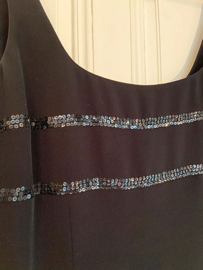 Jolie robe habillée parfaite pour les fêtes 🎉 Simple et chic, rehaussée de deux galons pailletés. Longueur 85 cm depuis le décolleté, 104,5 depuis le haut des bretelles, largeur aisselle à aisselle 46 cm. Entièrement doublée. Discrète fermeture éclair au dos avec crochet. État neuf.