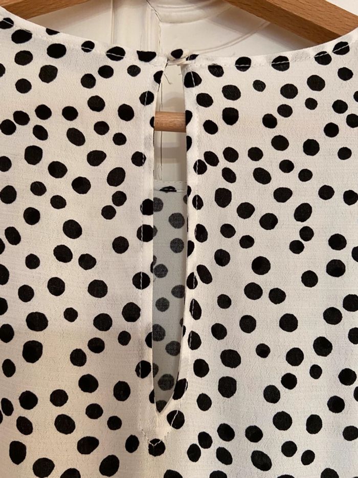 Volant au bas. Manches 3/4 fermées par petit bouton. Jolie fermeture forme goutte au dos. Portée une fois, comme neuve.