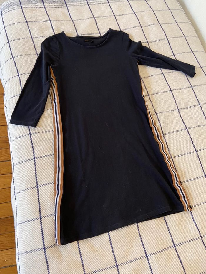 En jersey de coton noir avec bande contrastante en ruban gros grain ocre et blanche sur les côtés. Pour une adolescente correspond à un 14 ans. En lot avec d’autres articles uniquement.