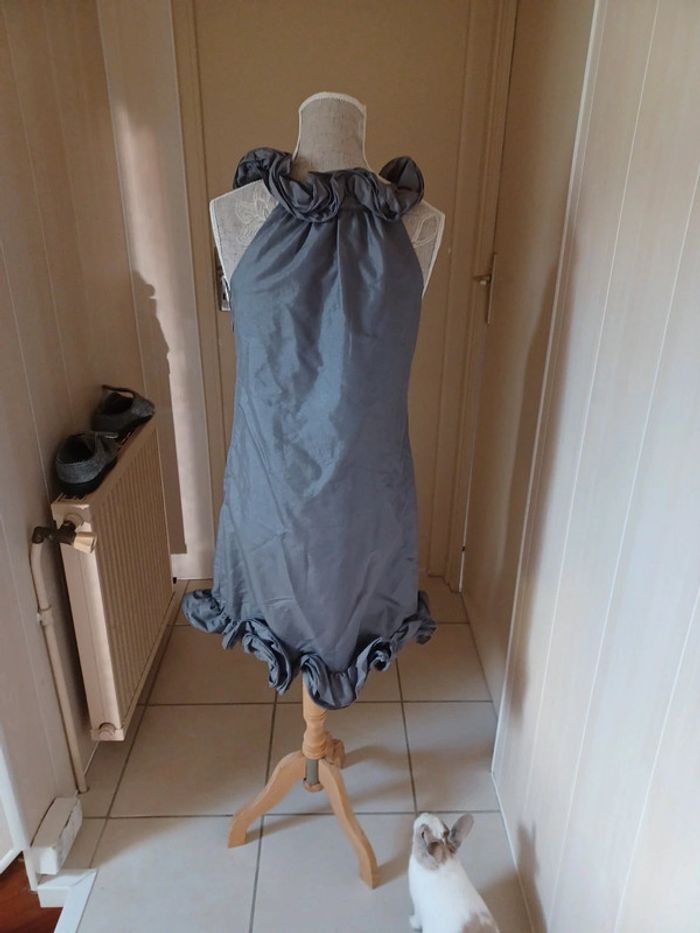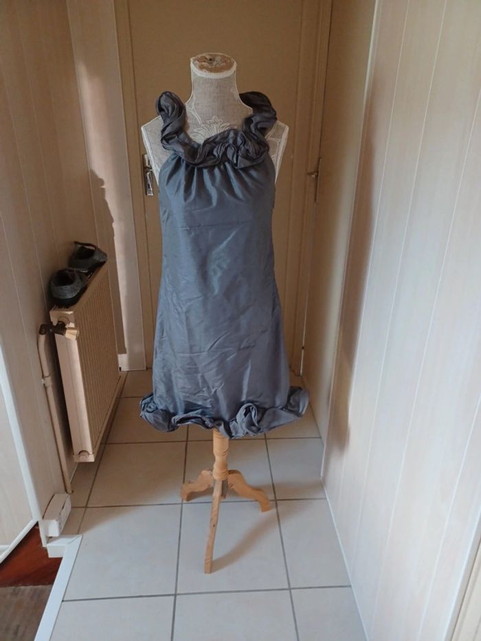Robe à porter aussi bien en soirée que pour les fêtes Marque : Xanaka Taille 36, grise Tissu extérieur : 51% Polyester 49% Polyamide Doublure : 100% Polyester (Lavage à 30°)