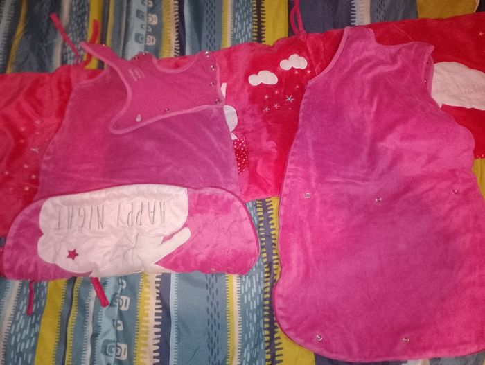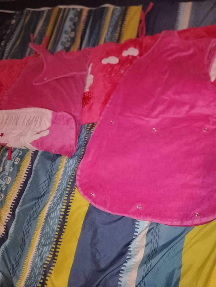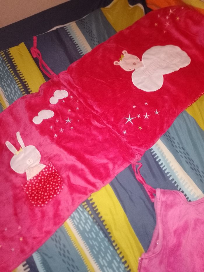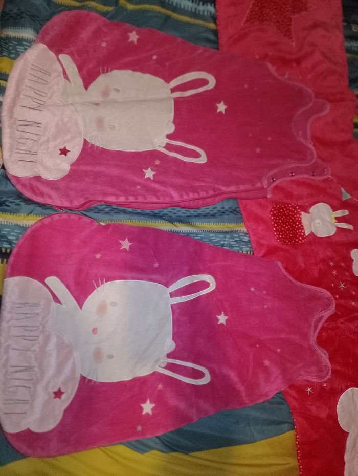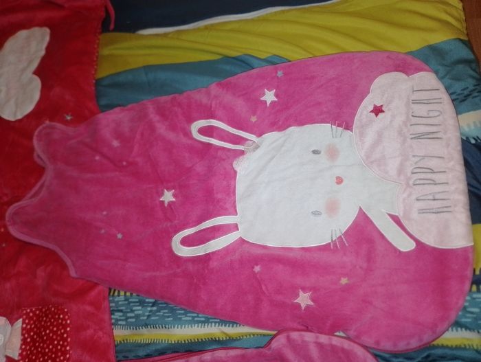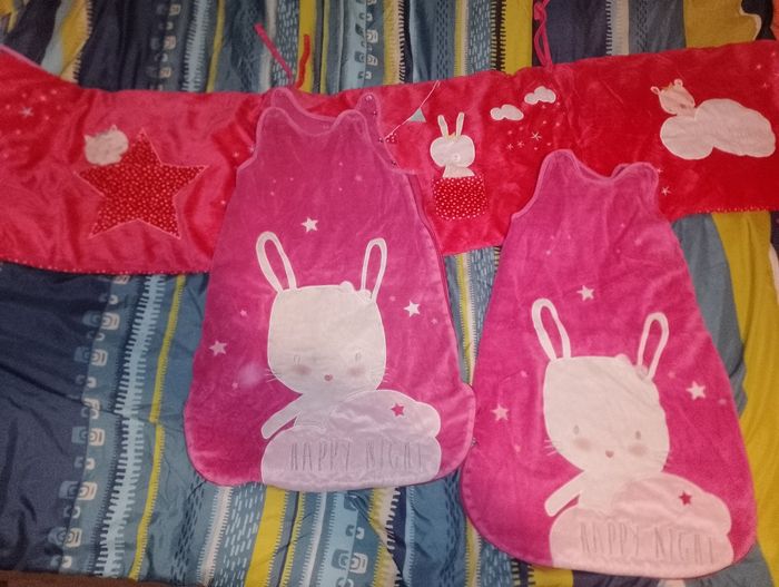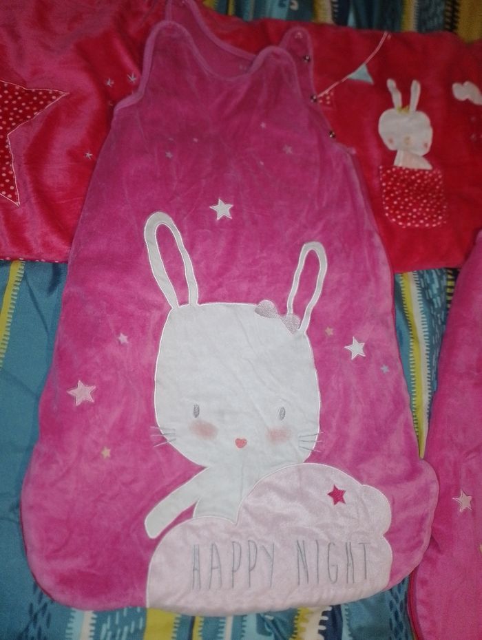 Ensemble tour de lit et gigoteuse kiabi Happy night motif lapin Tour de lit Kiabi rose 20euro 2 gigoteuse identique Kiabi 6-24 mois 1 en très bon état et l'autre à 1 des 3 hauteur de pression du derrière enlever (mais a priori elles ne servent à rien puisque les différentes hauteurs de pressions qui servent sont sur le devant) Idéal pour jumelles 15€ pièce