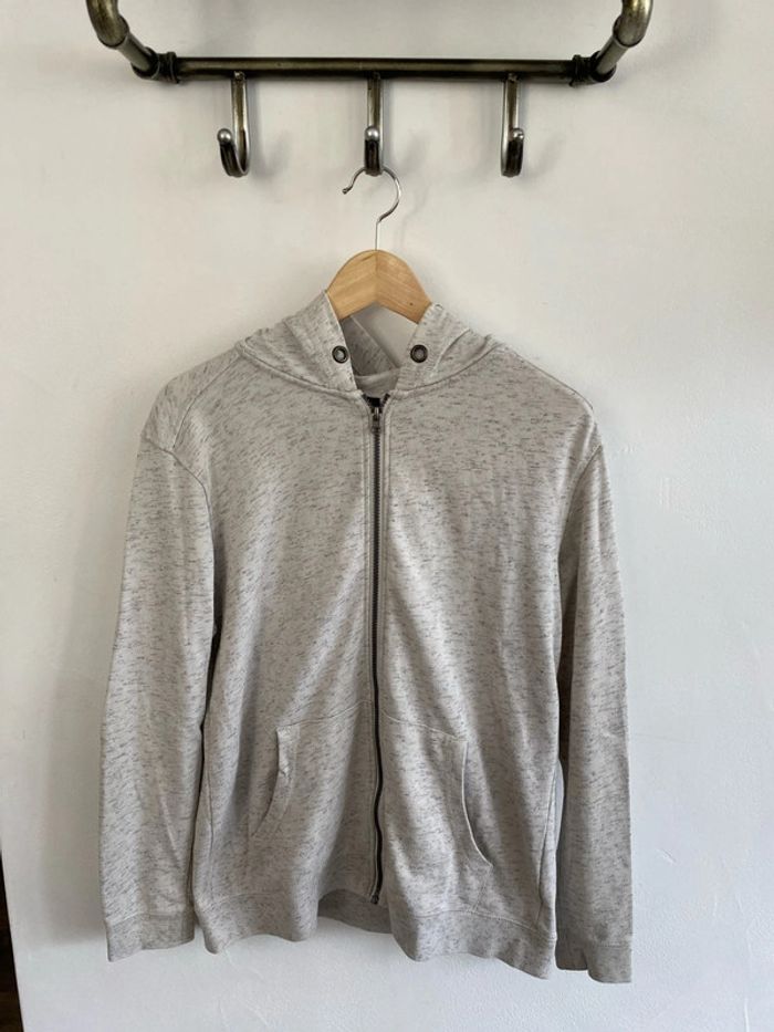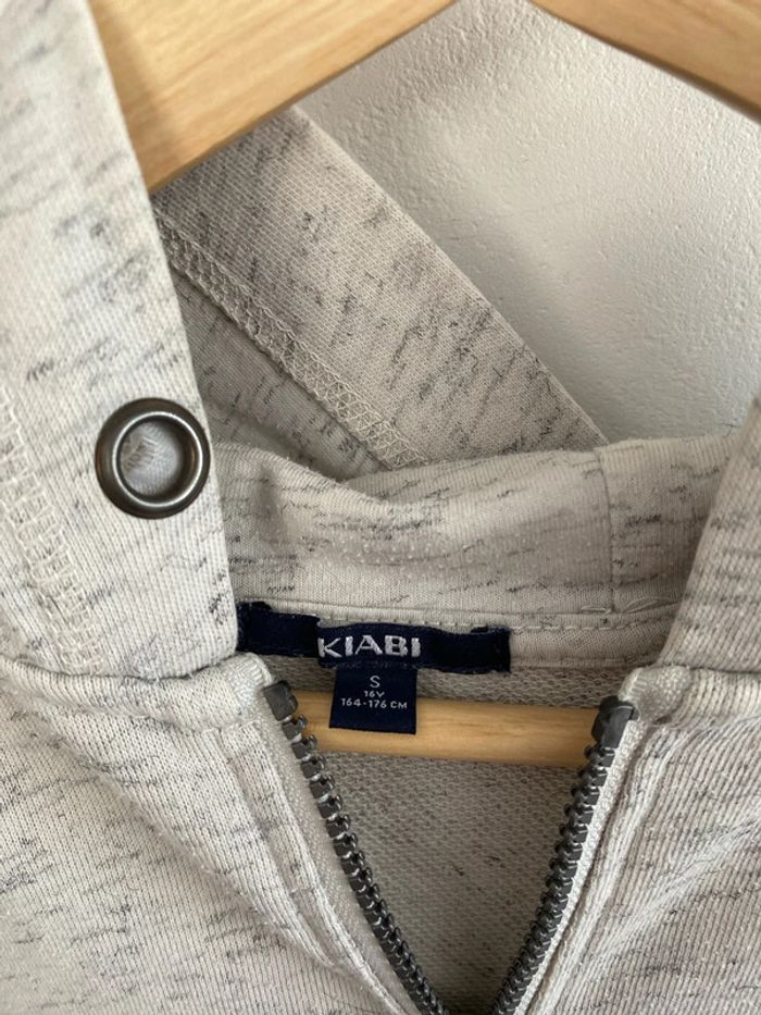 Gilet avec capuche, blanc gris, avec une poche centrale, porté quelques fois, le lacet pour la capuche est manquant. Taille : S Marque : kiabi Pour plus de renseignements, contactez-moi en privé.