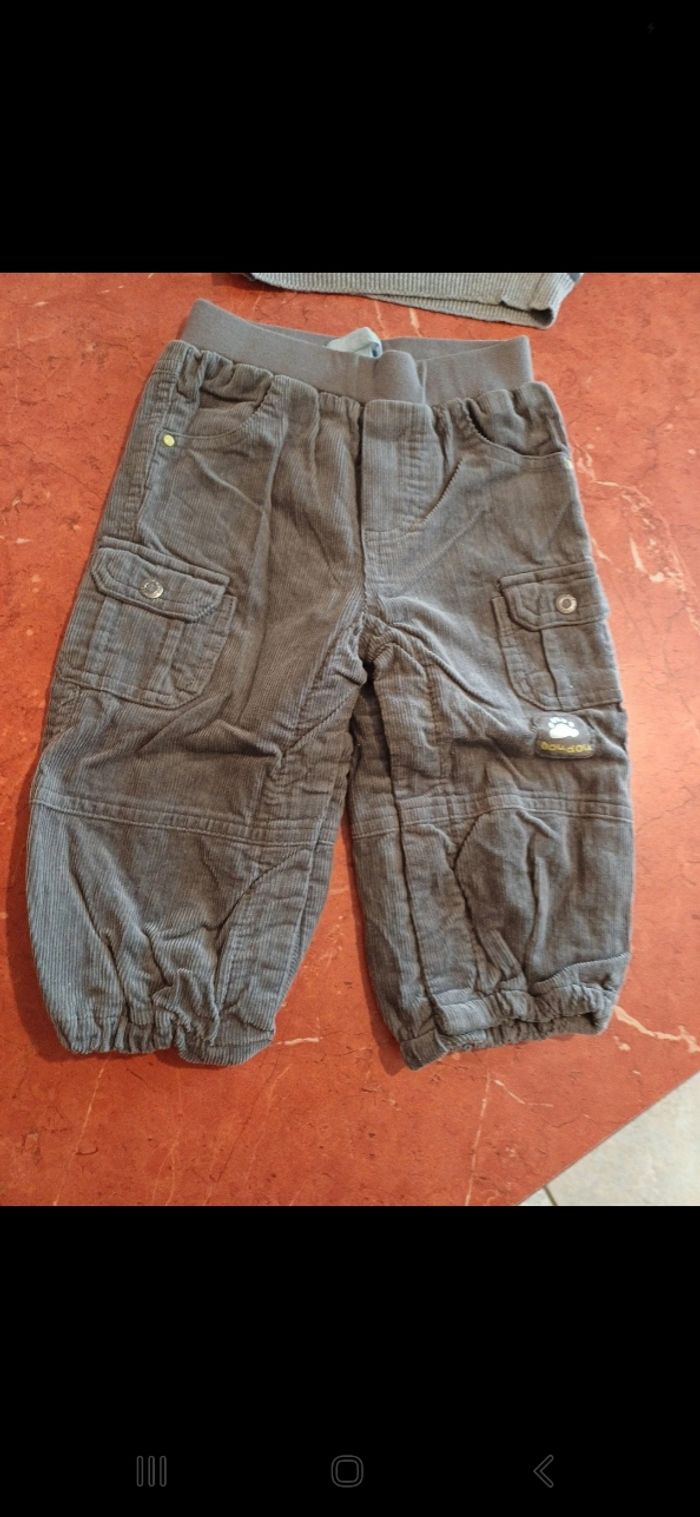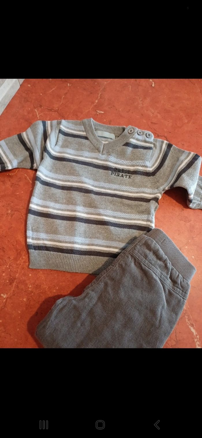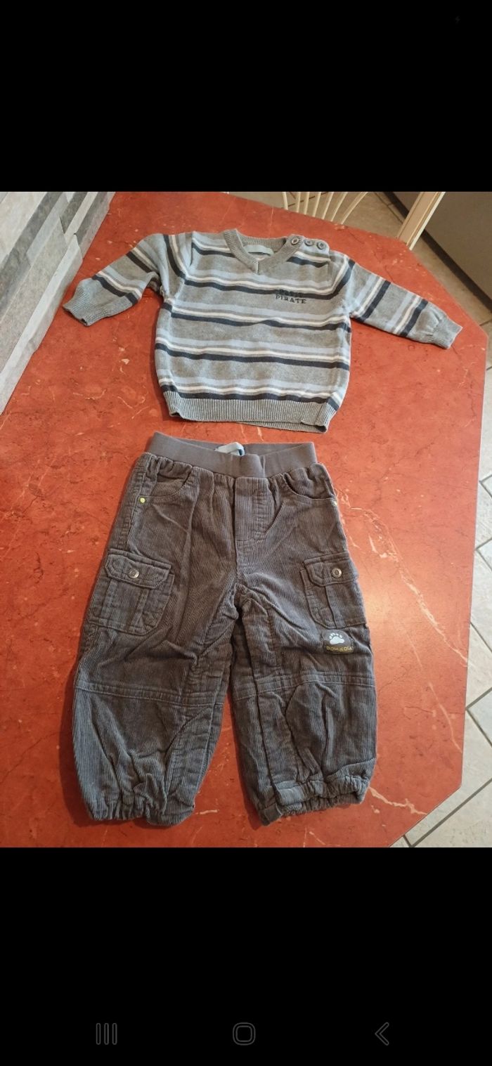 Ensemble comprenant un pull à rayures, col V , boutonné à l encolure et un pantalon en velours côtelé elastiqué à la taille et aux chevilles. Pressions à l entrejambe
