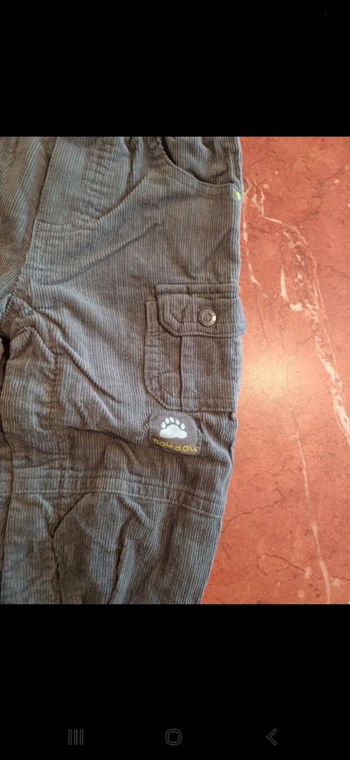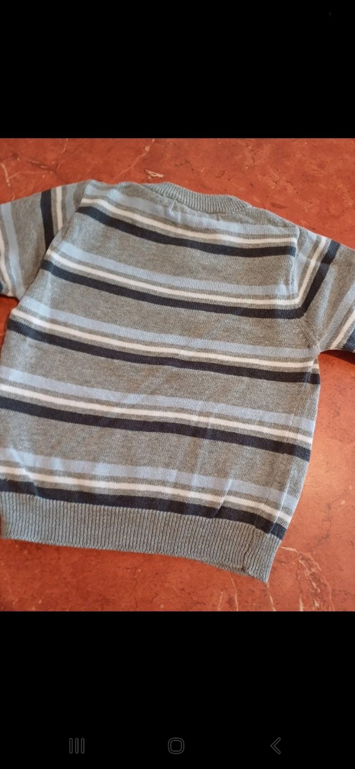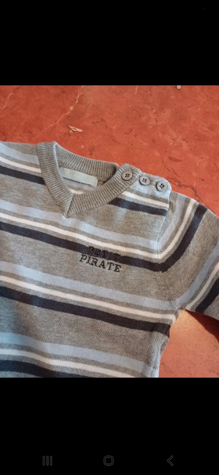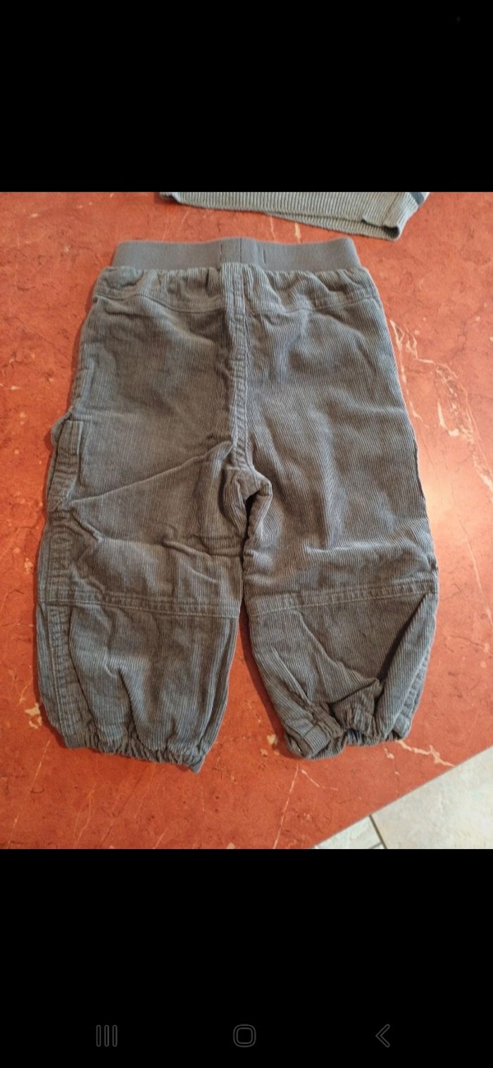 Ensemble comprenant un pull à rayures, col V , boutonné à l encolure et un pantalon en velours côtelé elastiqué à la taille et aux chevilles. Pressions à l entrejambe