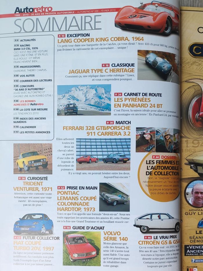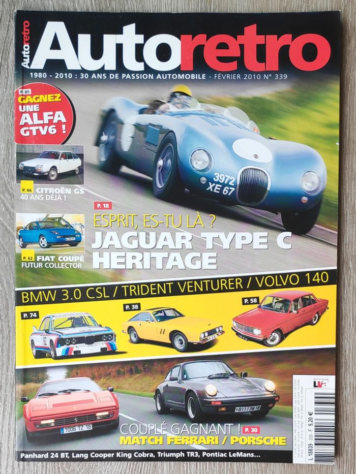 #_AutoRétro_ numéro 339 (février 2010) Lang Cooper King Cobra, #_Jaguar_ Type C Héritage, #_Ferrari_ 328 GTB vs #_Porsche_ 911 Carrera 3.2, Trident Venturer, Pontiac Le Mans, Fiat Coupé Turbo 20v, Volvo Série 140, Citroën GS et GSA... 130 pages D'autres numéros disponibles dans mon dressing