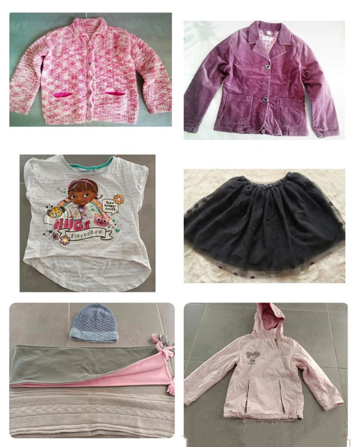 128 cm 🚨Lot indissociable ⛔ Composé de : - une jupe noire - une veste prune - un gilet tricoté main - une écharpe épaisse, doublée et réversible - un grand tour de cou - un bonnet tricoté main - une veste doublée - un tee-shirt Doc la peluche De bon état à neuf #8ansfillecamilled974
