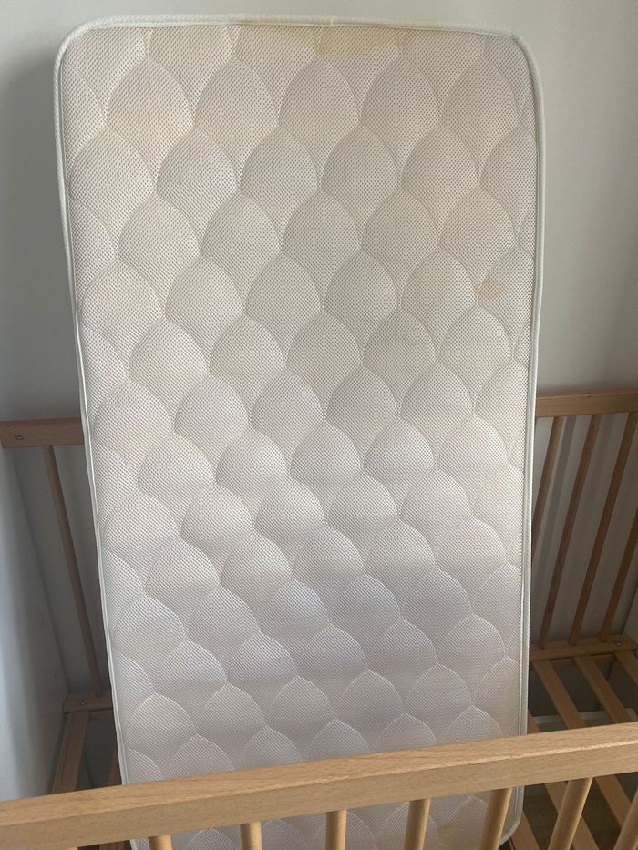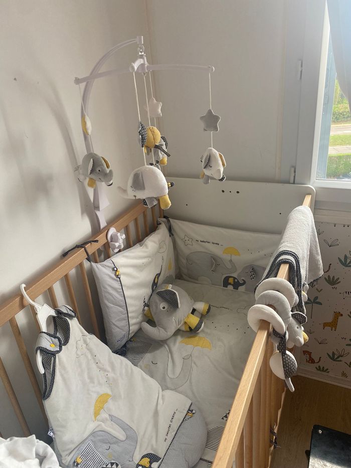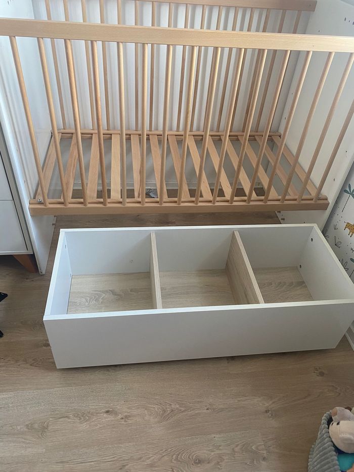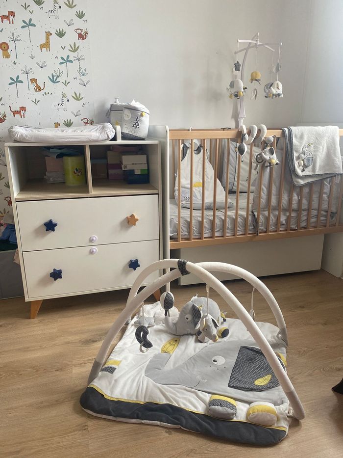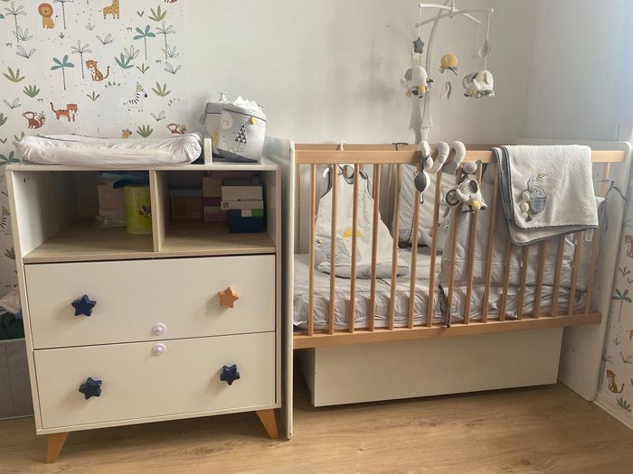 Nous vendons une chambre complète pour l'arrivée d'un nouveau né à savoir : - Lit bébé combiné 120x60 transformable lit 90x190 Oslo boutons étoile Le lit combiné évolutif Oslo au style scandinave va enmener bébé au pays des fjords et des forêts ! Composé d'un lit bébé 120x60 et d'une commode à langer agrémentée de jolis boutons en forme d'étoile, il deviendra, par simple transformation, un véritable lit junior de 190x90. Dimensions : 198 x 102 x 67 NORMES ET QUALITE: Garanti sans solvant Panneaux garantis avec une teneur en formaldéhyde de 4 mg/100g Fabrication française, hormis sommier Fabrication Europe A cela s'ajoute : - Le matelas hypoallergénique - Le coffre à jouet - Tour de lit baby fan - 3 paniers gigogne - Spirale - Edredon 120*60 - Mobile - Douillette 6-24 mois - Couverture - Tapis d’éveil Unitairement le tout vaut 1345€ . N'hésitez pas à nous contacter pour plus de renseignements.