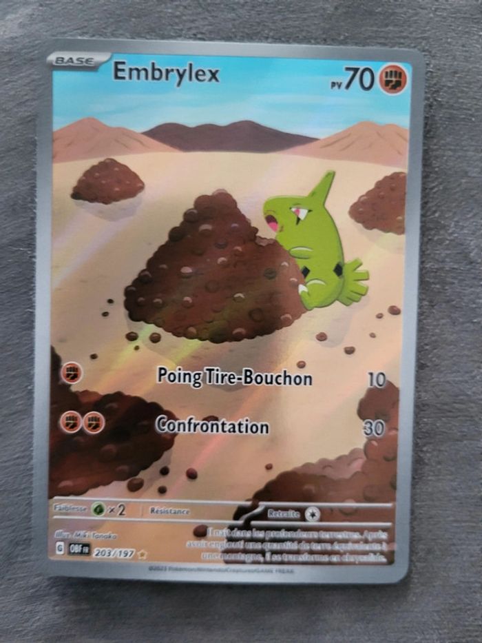 Carte pokémon Embrylex 203/197 de la série flammes obsidiennes . Sortie de booster mise sous sleeve.