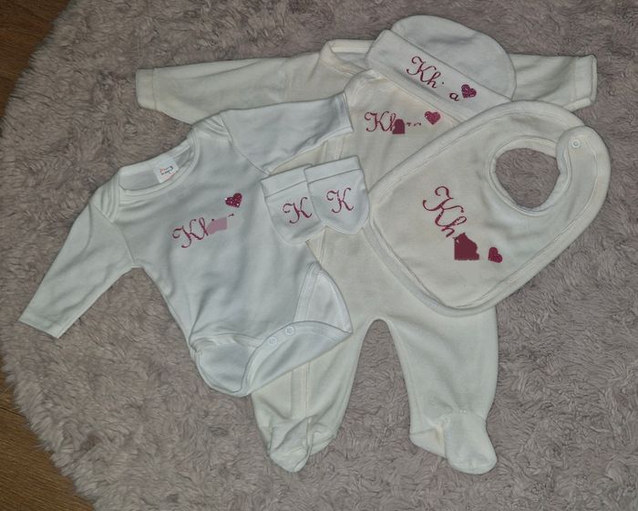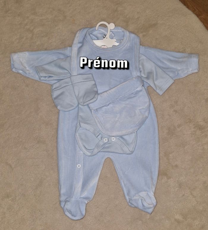 ⚠️CONTACTÉ MOI AVANT DE VALIDER VOTRE COMMANDE Cette annonce comporte le pyjama, le body, un bavoir, un bonnet, les gants. A personnalisé avec le prénom de votre choix et le symbole de votre choix ( cour,couronne,étoile ect ) Plusieurs couleur de police disponible hésiter pas a me contacter pour plus d'informations Pyjama, bonnet, bavoir en velour. Les gants et le body en coton.