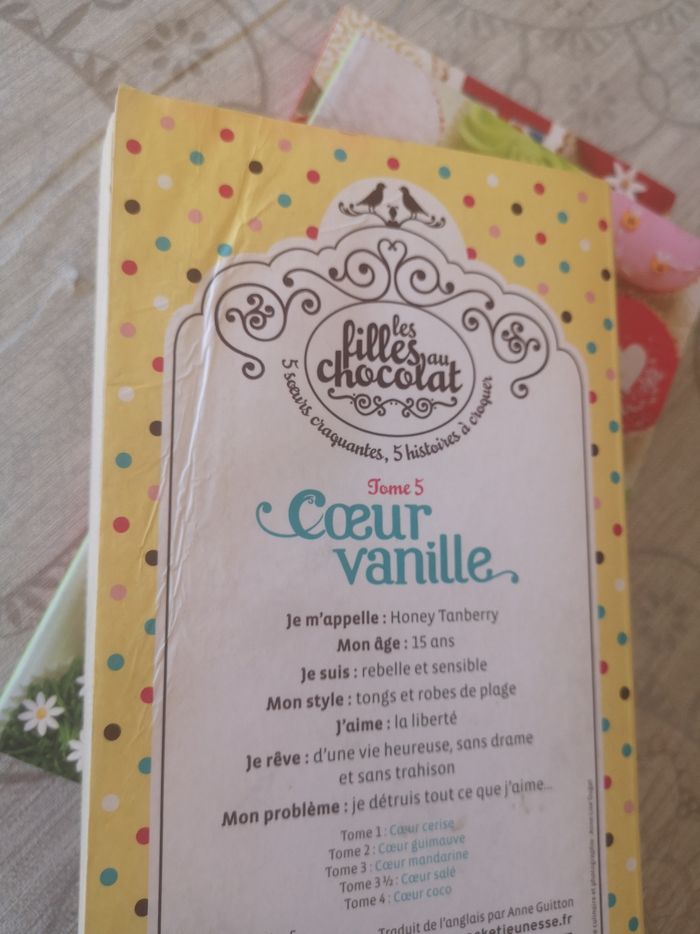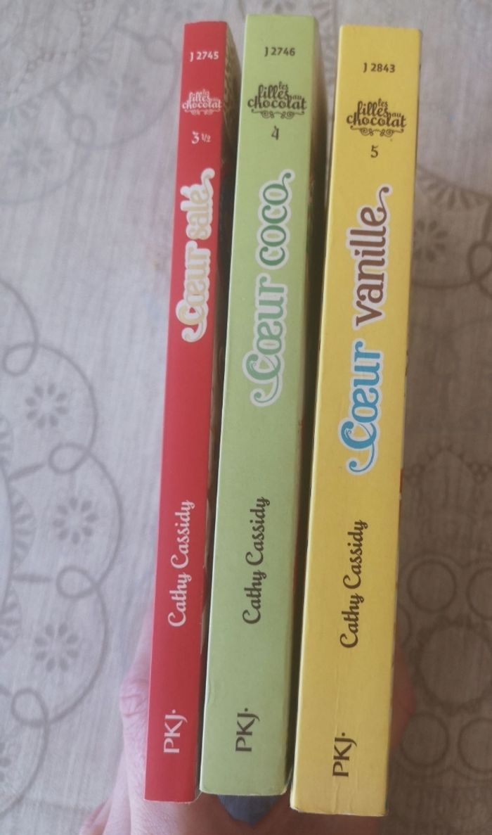 Lot de 3 livres de la série les filles au chocolat Cœur salé Cœur coco Cœur vanille Cœur vanille est plus abîmé, voir dernières photos Sinon bon état, les pages ont jaunis au pourtour dû au stockage