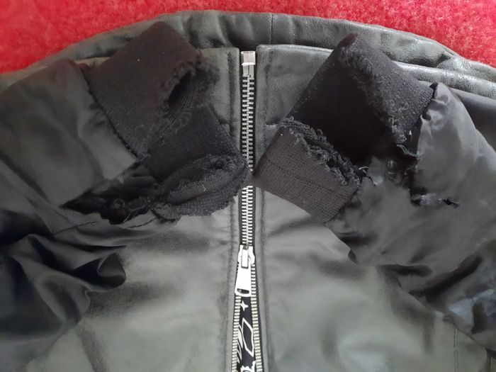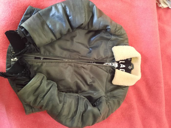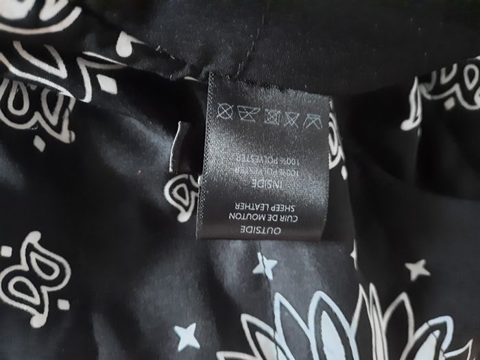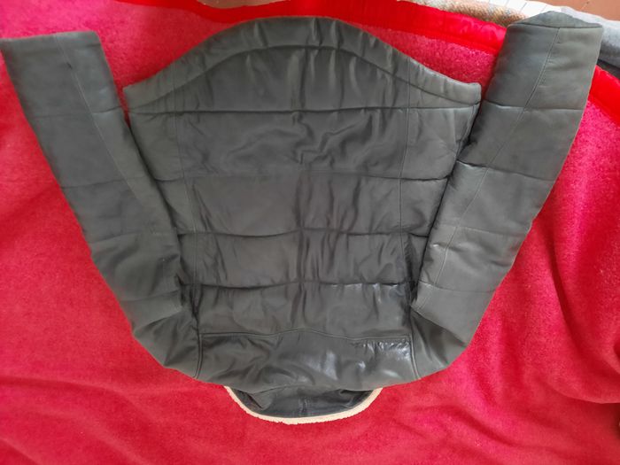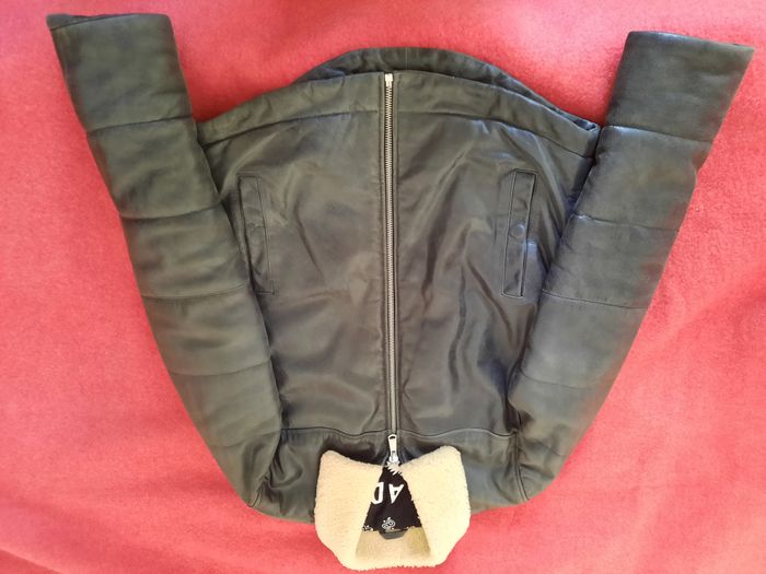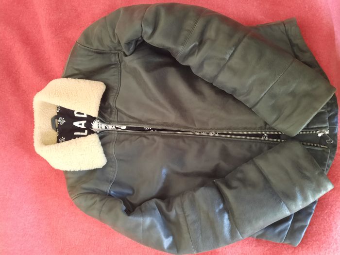 Blouson en cuir marque LADC. Taille M. Doublure matelassée et col (non amovibles). Acheté 210 euros en Février 2023. Défaut non visible de l'extérieur: le tissu des manches intérieures est à raccommoder: voir les photos.