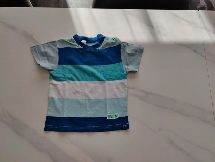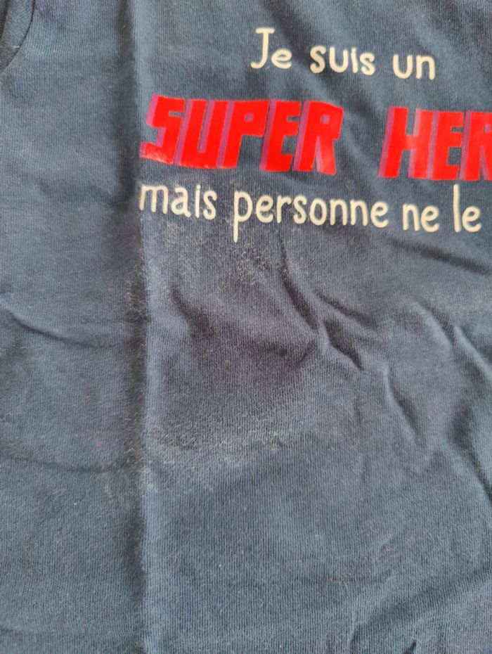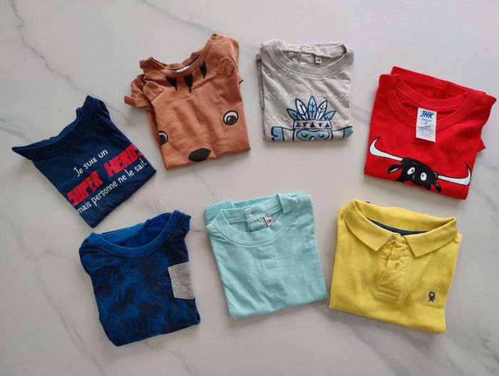 Lot de 7 t-shirts + 1 polo manches courtes de différentes marques Le polo jaune a une petite tâche à côté du logo (cf photo) Le t-shirt bleu : en le repassant le motif a un peu bavé (cf photo) Le t-shirts a rayures bleu : décoloré+ tâche sur le devant Le t-shirt rouge : neuf (juste lavé) Les 4 autres t-shirts : porté plusieurs, ils sont décolorés Taille : 23 mois / 2 ans / 86cm