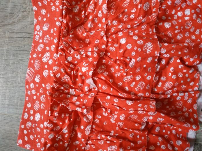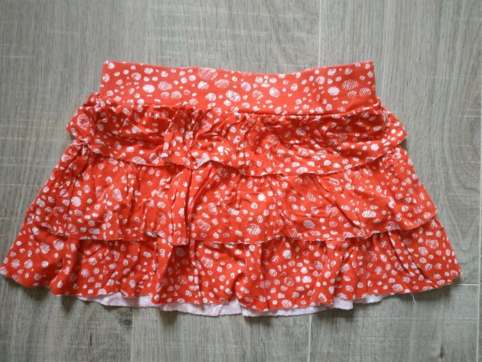 Jupe légère pour cet été Rouge avec des rond Blanc hachuré. Peu porté en très bon état Orchestra 4 ans