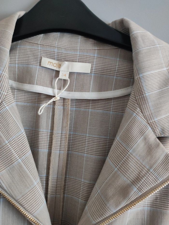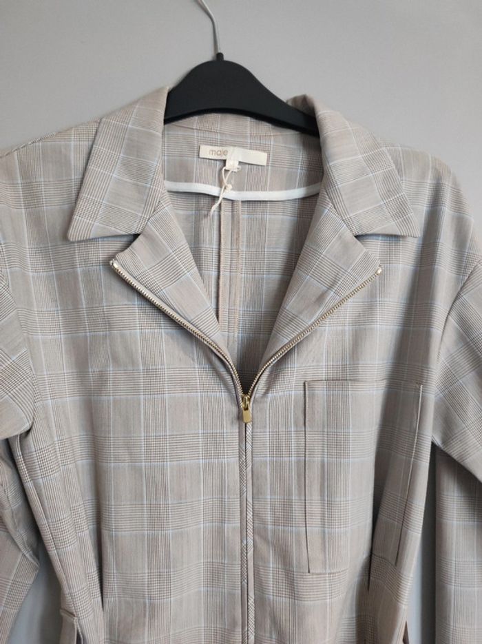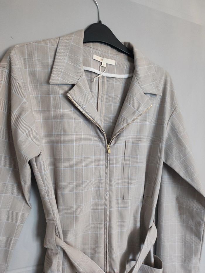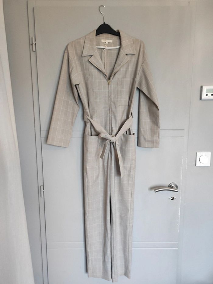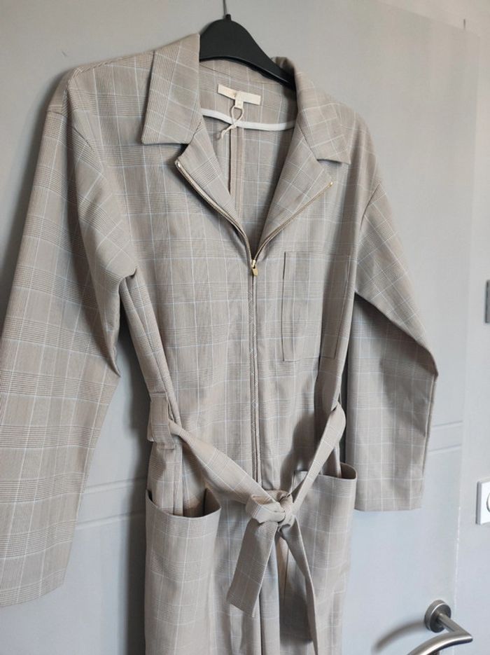Combinaison avec 1 poche sur la poitrine et 2 aux jambes normales. Fermeture sur le devant tout le long. Vous pouvez ajuster le décolleté comme ça. Jamais porté Acheter car je la trouvais belle.mais elle est un peu juste et je suis pas a l'aise . Beige avec du quadrillage bleu,blanc et marron