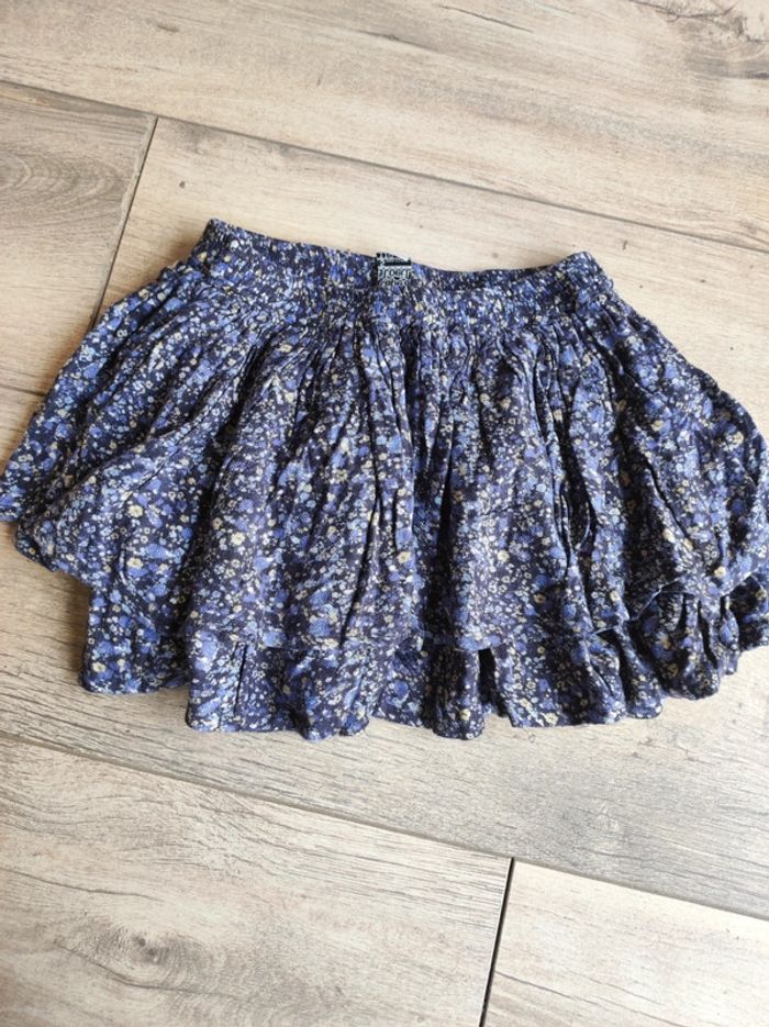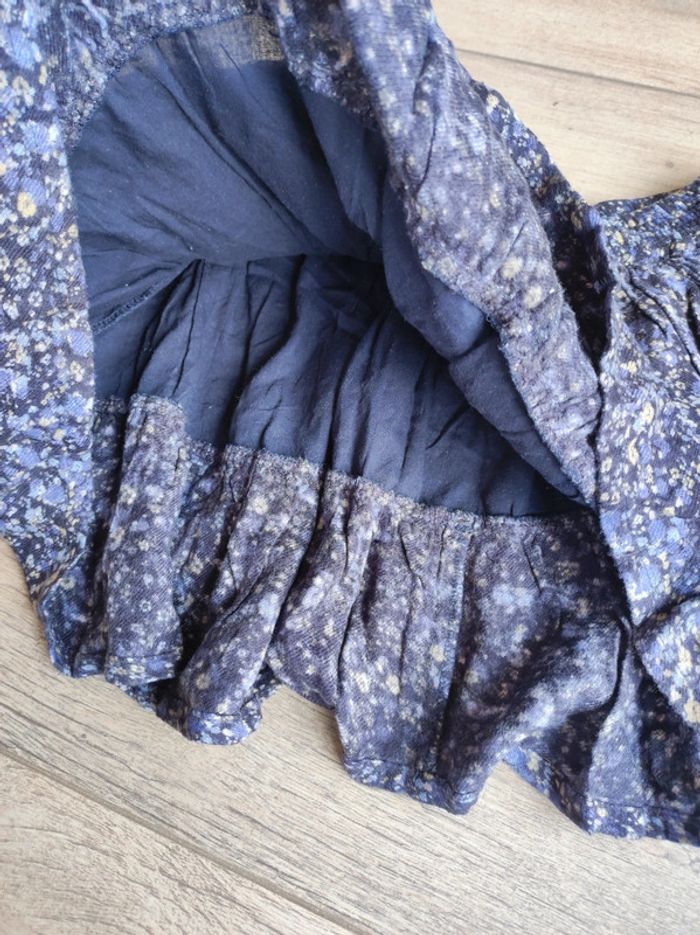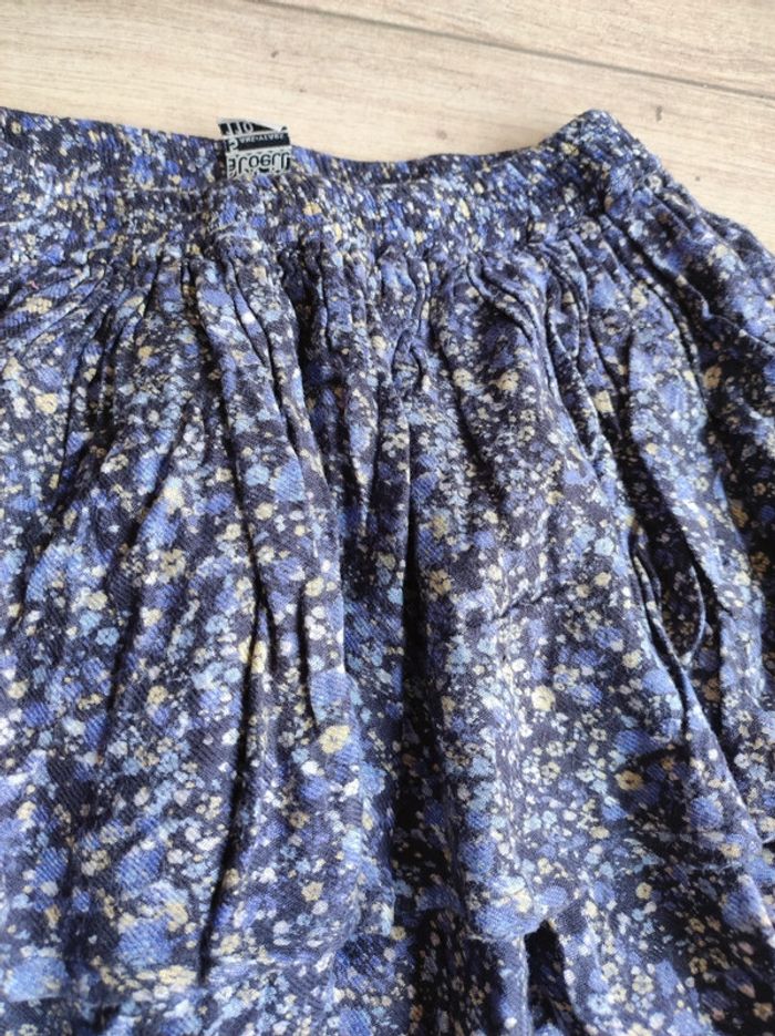 Jupe mi saison . Très bon état . Taille élastique. 5 ans mais taille plutôt 6. Bleu marine avec fleur jaune et bleu Tape à l'oeil