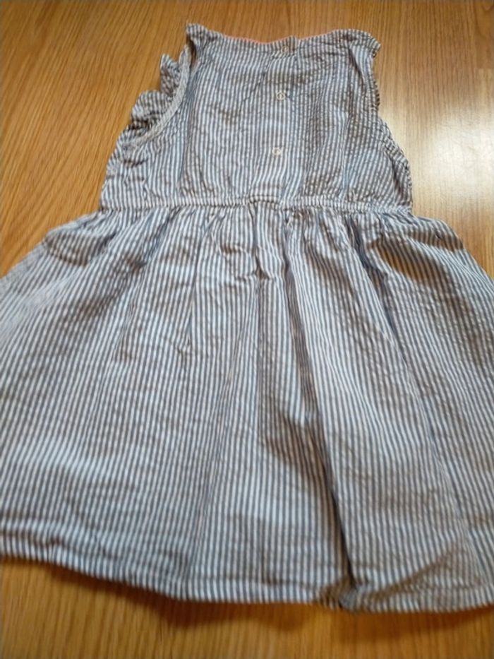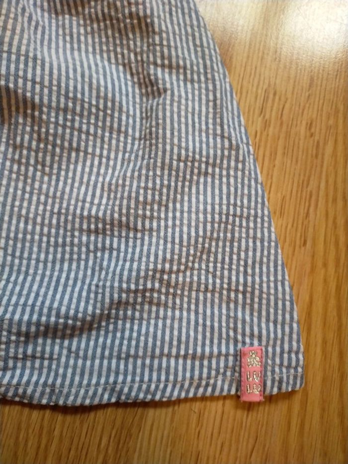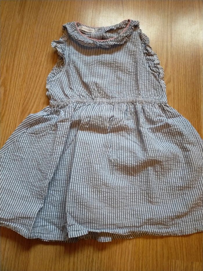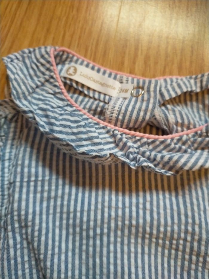 Très jolie robe Lulu castagnette. Encolure et manches volantées.. Fines rayures bleues et blanches