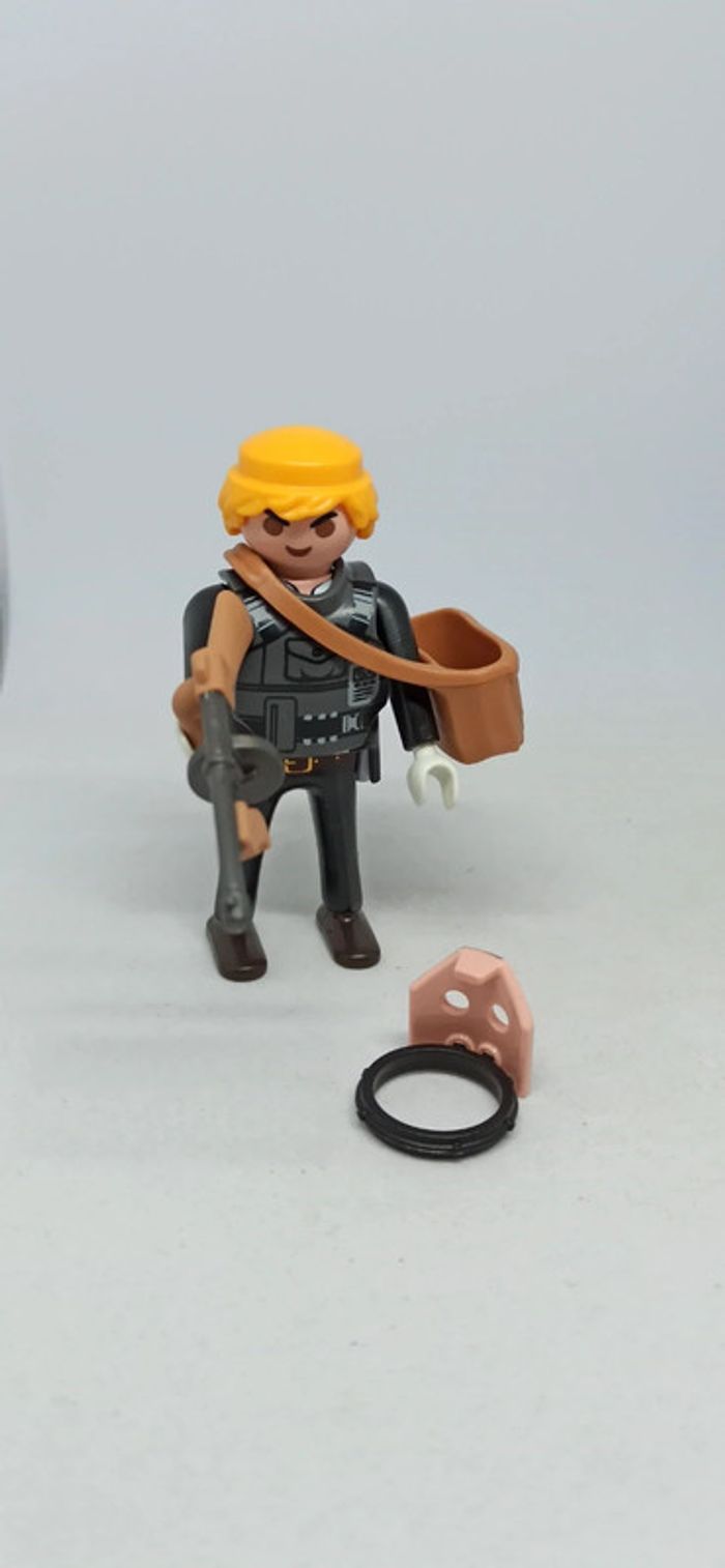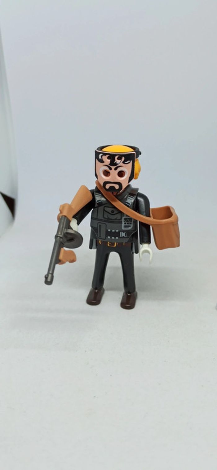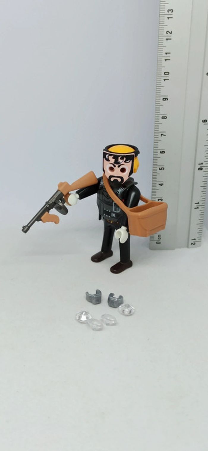 Homme braqueur de banque gangster avec masque et butin playmobil