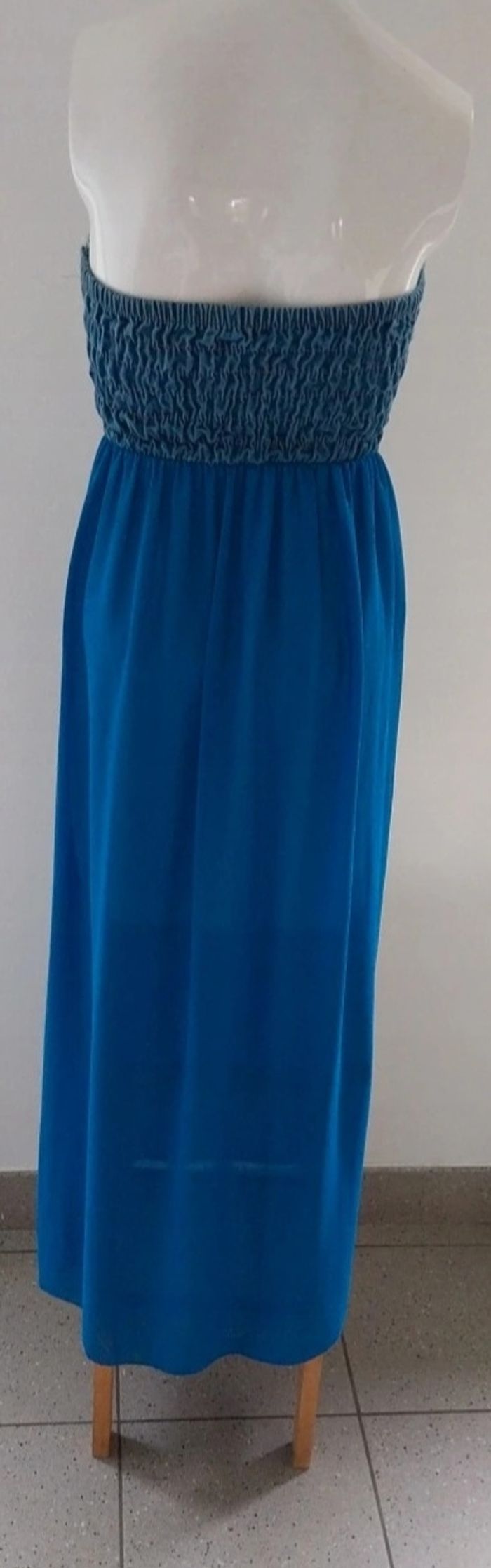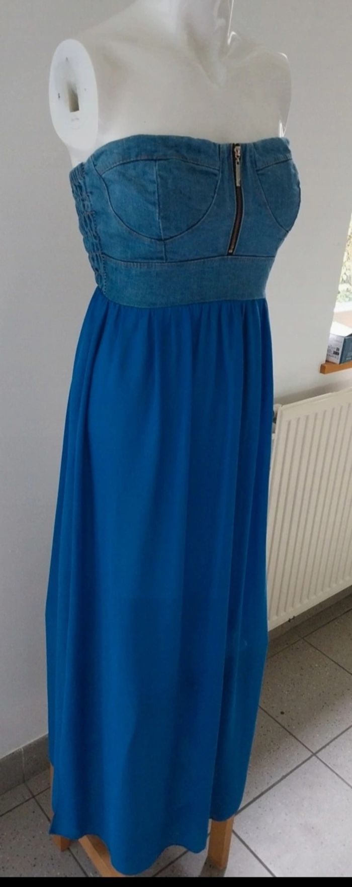 Robe bustier longue jeans et voilage peu portée. Taille 36. Doubler jusqu'au dessus des genoux.