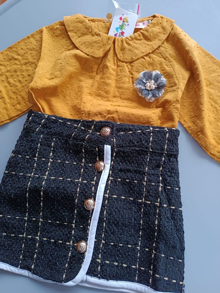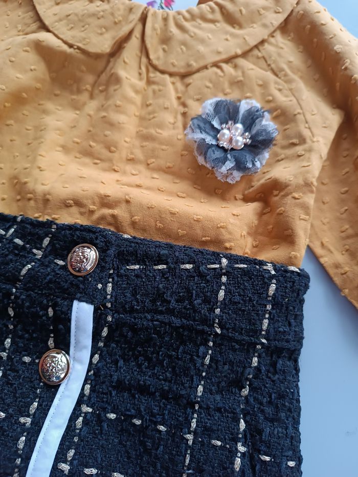 Ensemble jupe en tweed détails dorés et jolis boutons métal, blouse 100% coton à plumetis, col claudine et fleur bijou poitrine