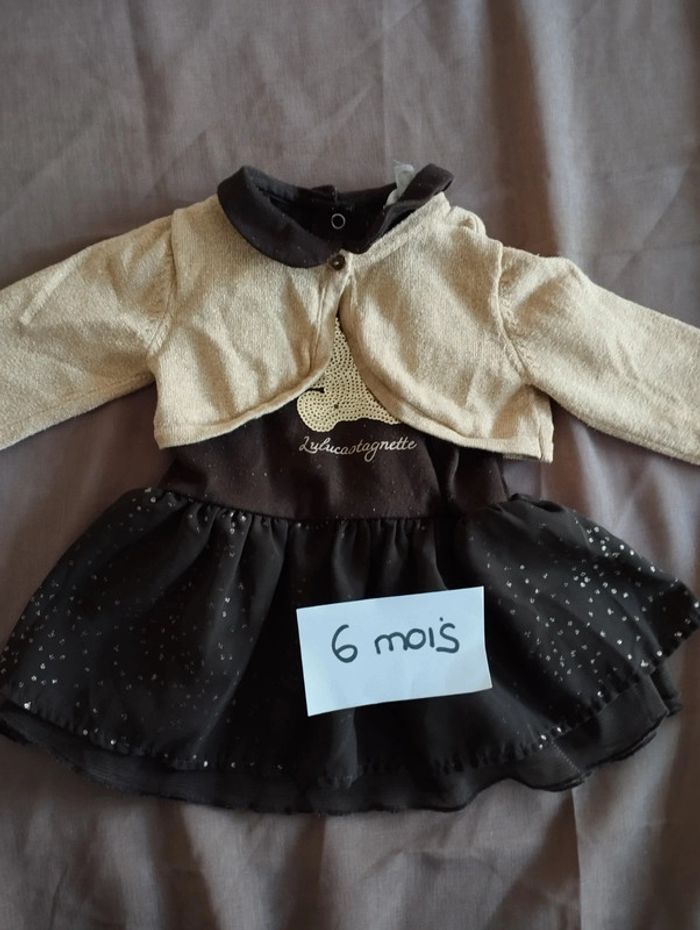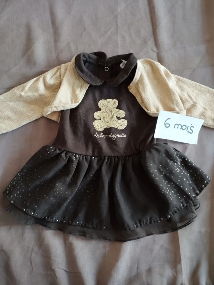 Ensemble Lulu Castagnette, taille 6 mois. Une robe sans manche avec un voile pailleté. Quelques paillettes sont parties. Avec un cache cœur doré manches longues. Très bon état général.