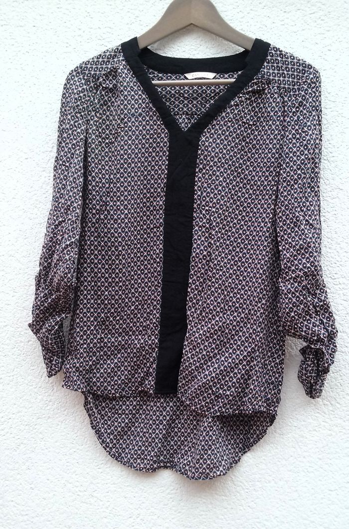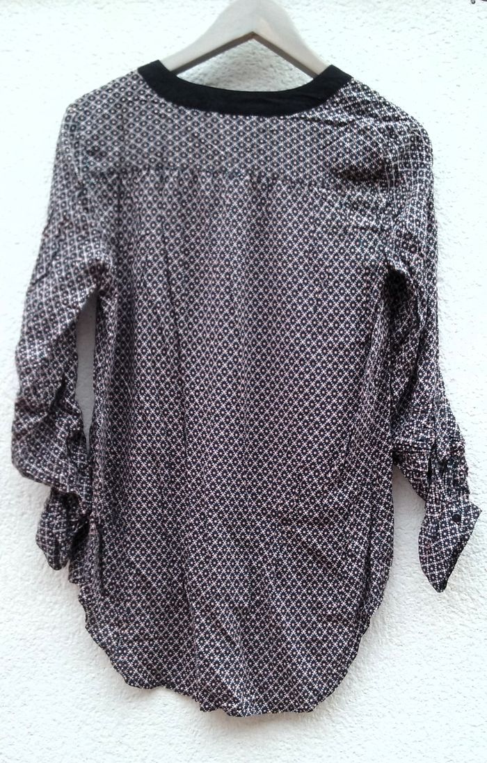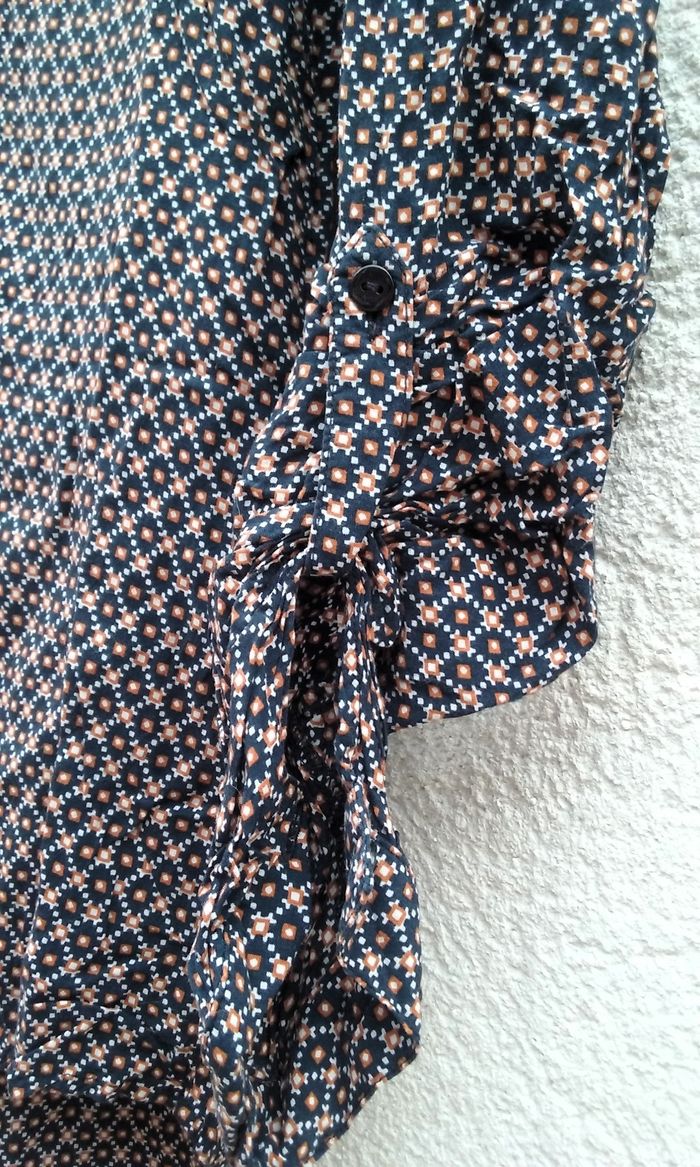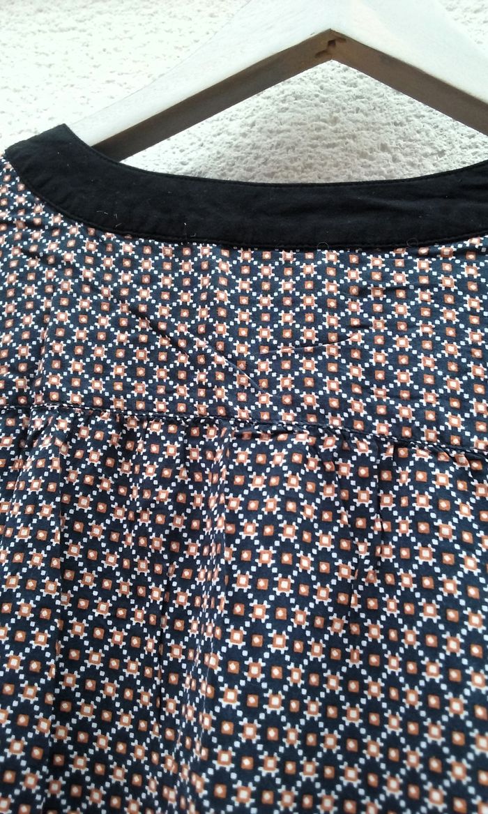 Tunique très sympa avec un arrondi plus long au dos, des manches rétractables, les coloris sont bleu marine, rouille, et blanc pour les motifs et noir pour le col.