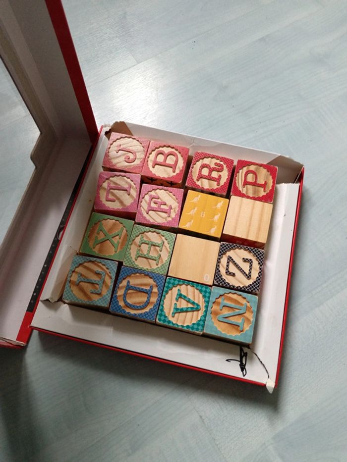 Lot de cubes, la boîte à souffert mais les cubes sont intacts, idéal pr apprendre les lettres de manière ludiques style Montessori