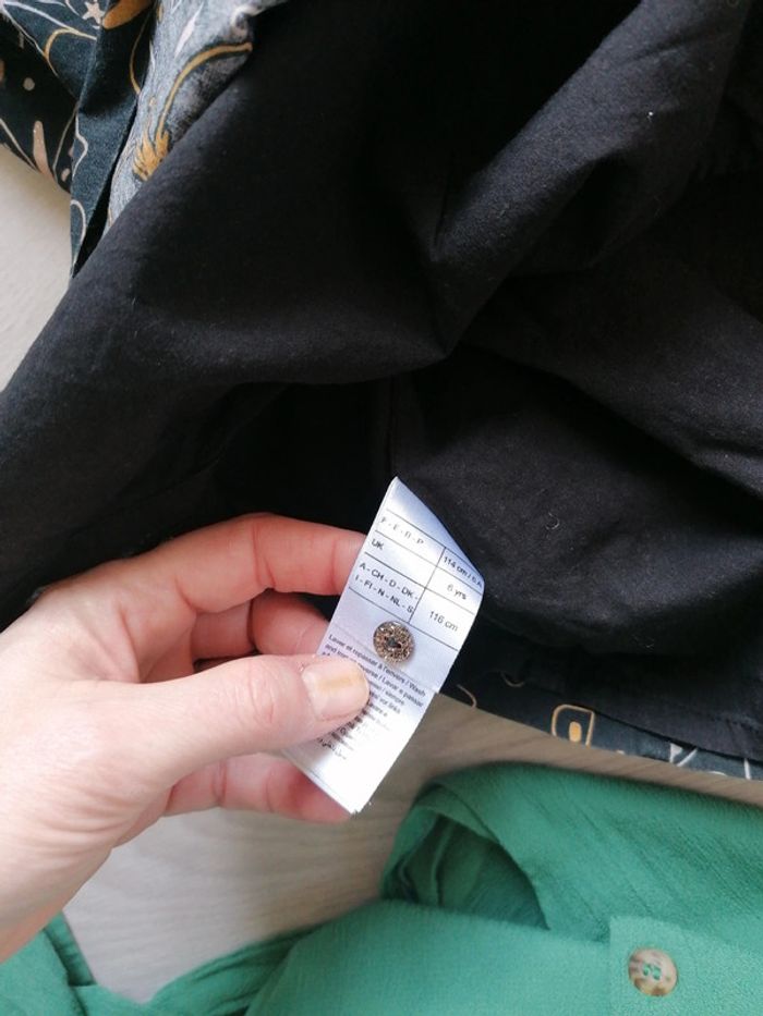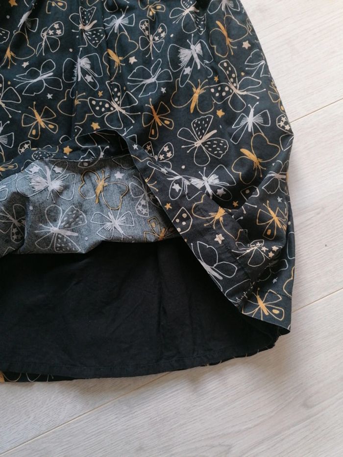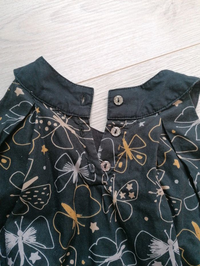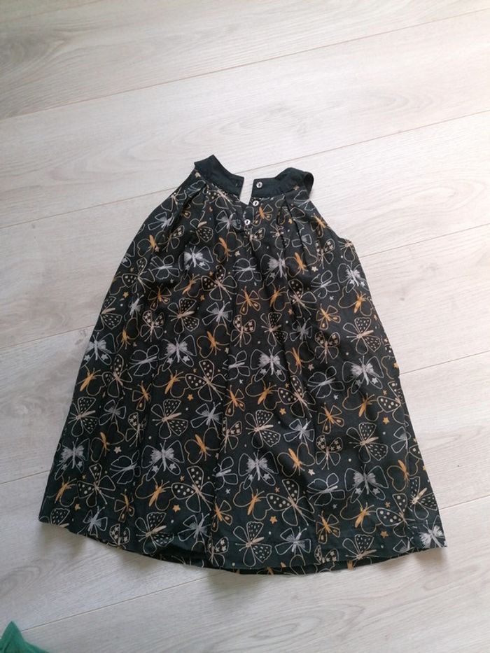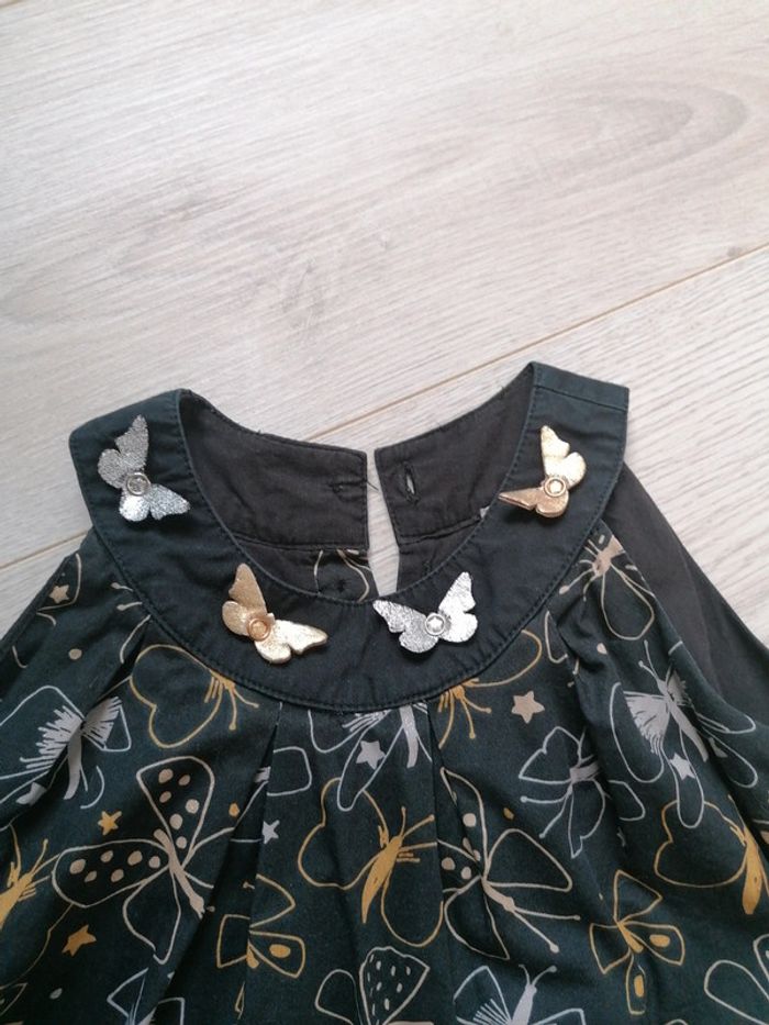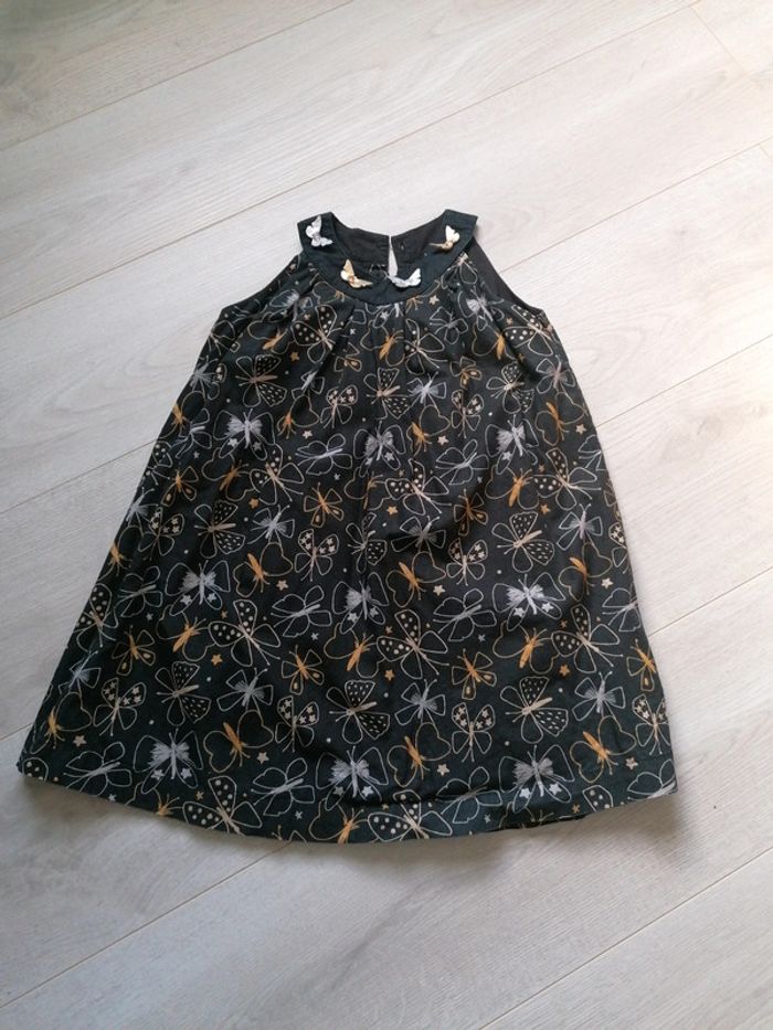Très jolie robe noire avec des papillons dorés et argentés. Taille 6 ans. Doublure noire. Fermeture par 3 petits boutons dorés dans le dos. En parfait état.