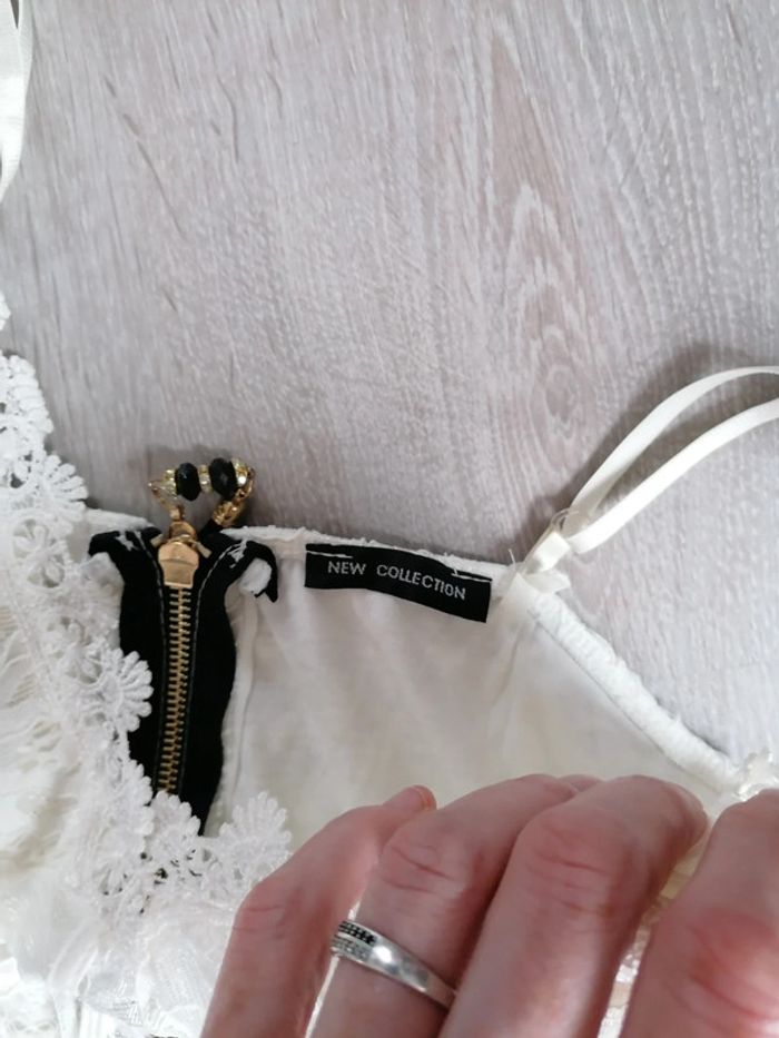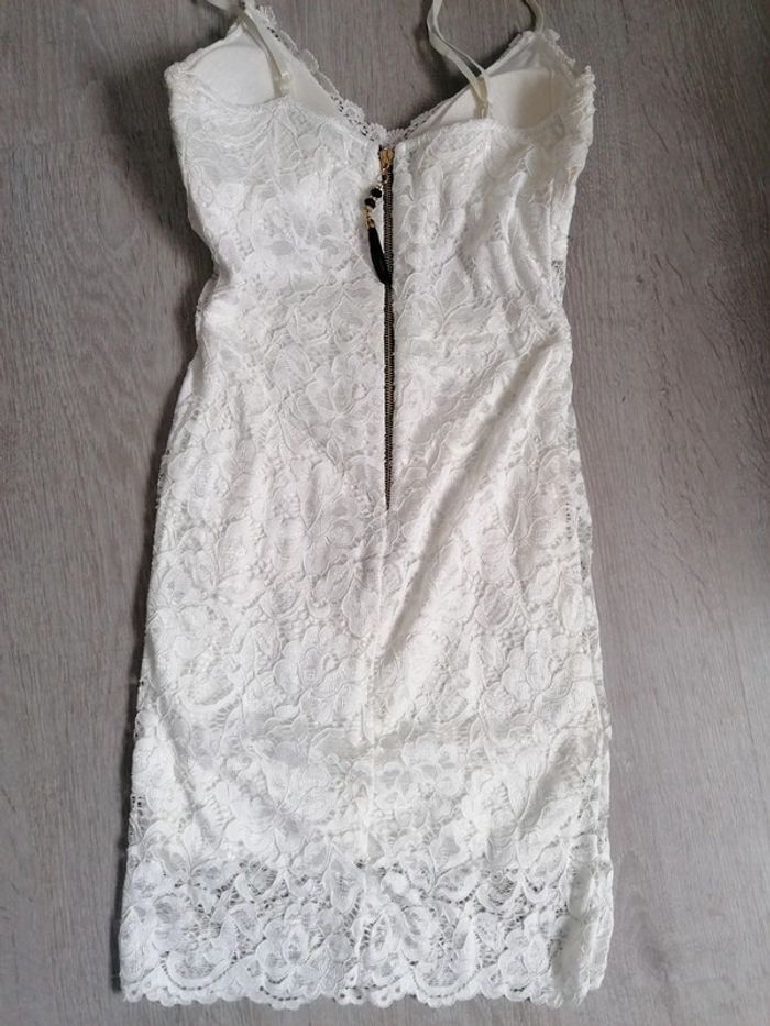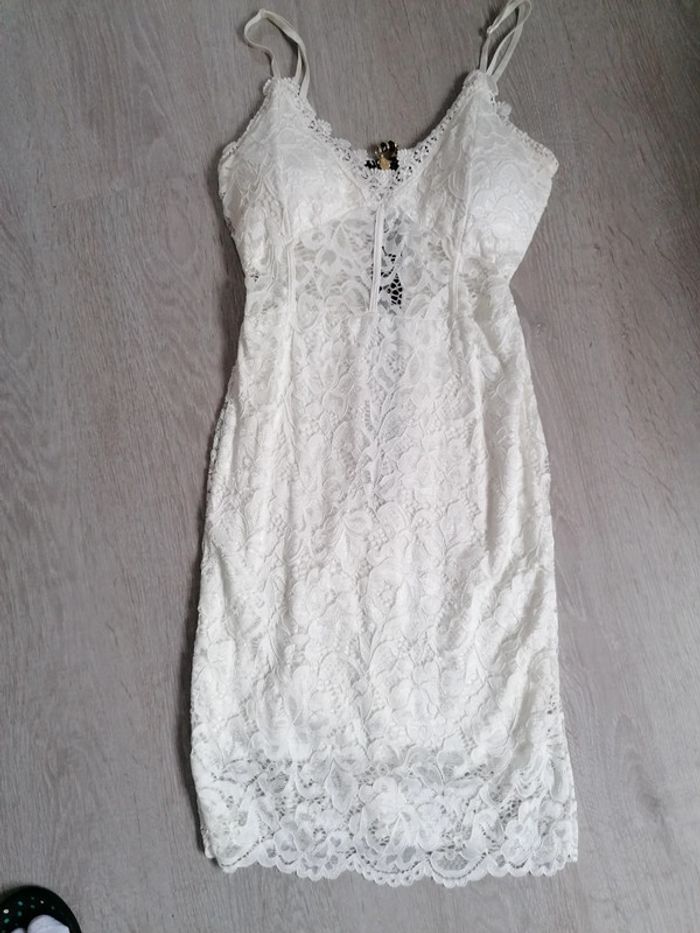 Robe moulante en dentelle blanche. Bretelles réglables. Doublee sauf une partie sous la poitrine qui laisse apparaître la peau. En polyester et viscose. Neuve sans étiquette. Taille unique.