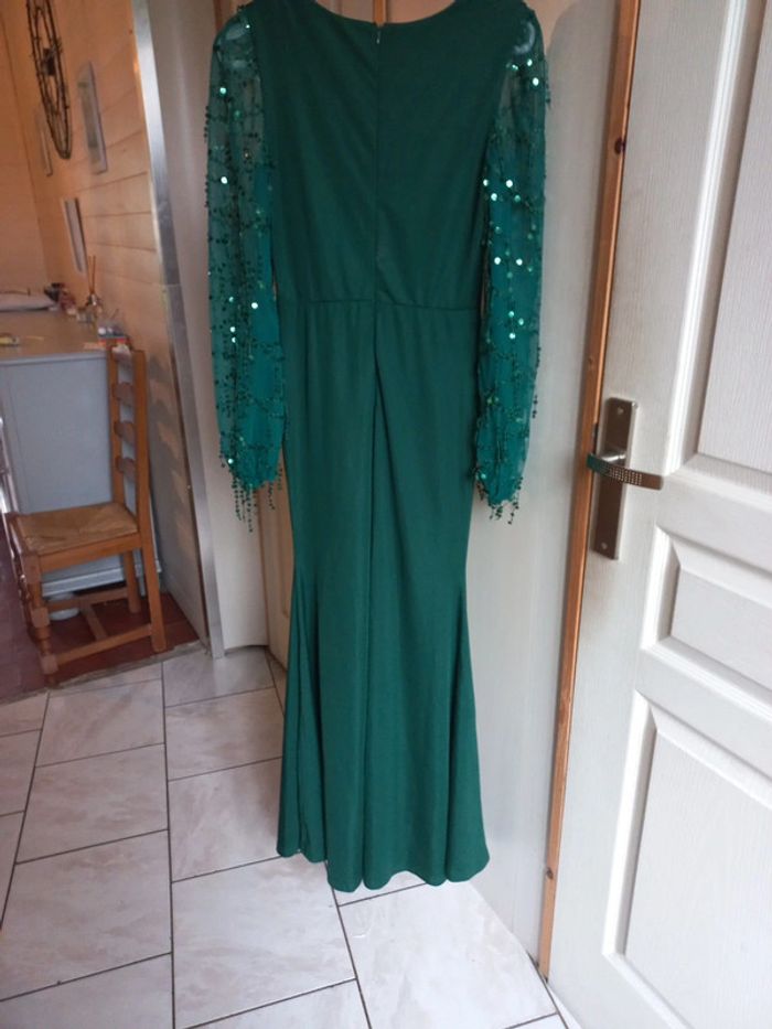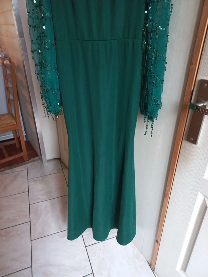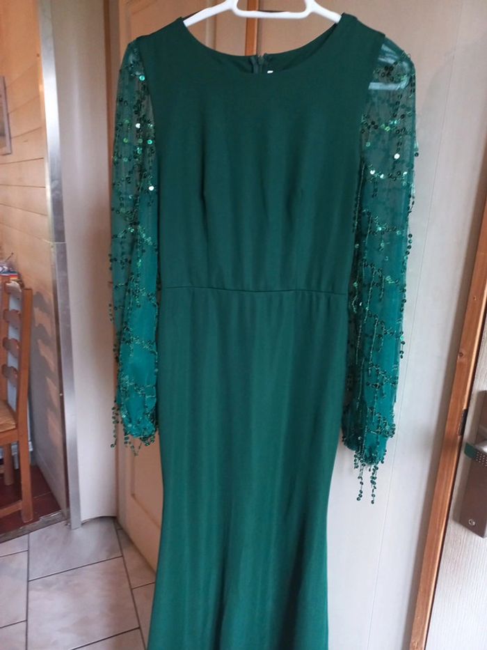 Robe de soirée/cérémonie Verte sapin Longue Manches longues transparentes à sequins Taille M Fermeture dans le dos