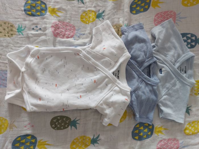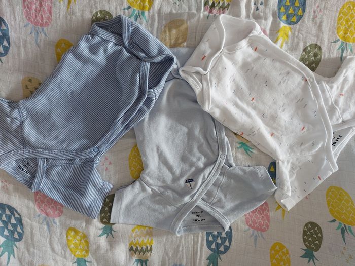 Vends bodies croisés manche courte bébé garçon Taille 1 mois, porté 1 fois du en très très bonne état. Bébé a grandi trop vite.