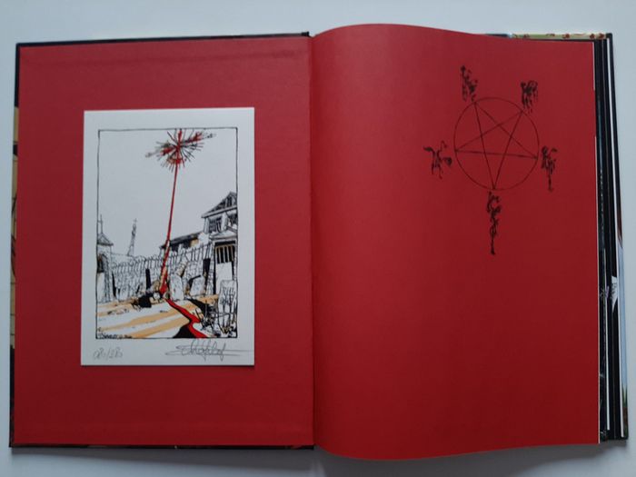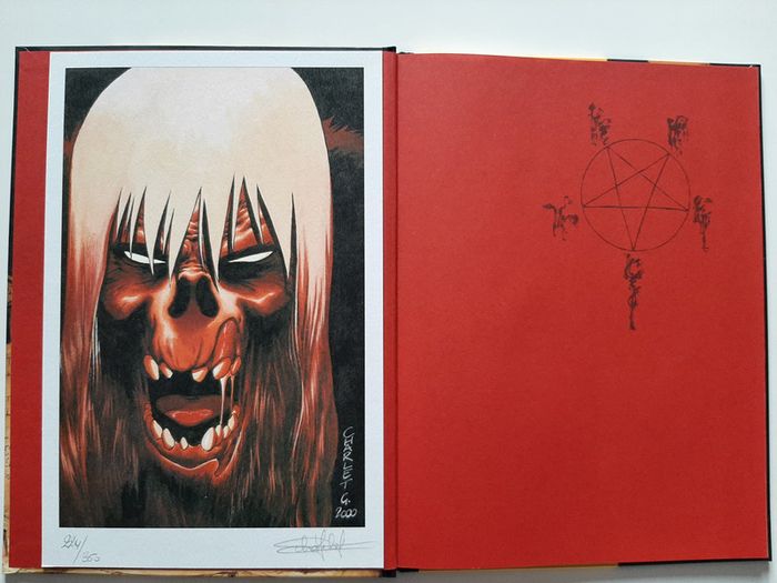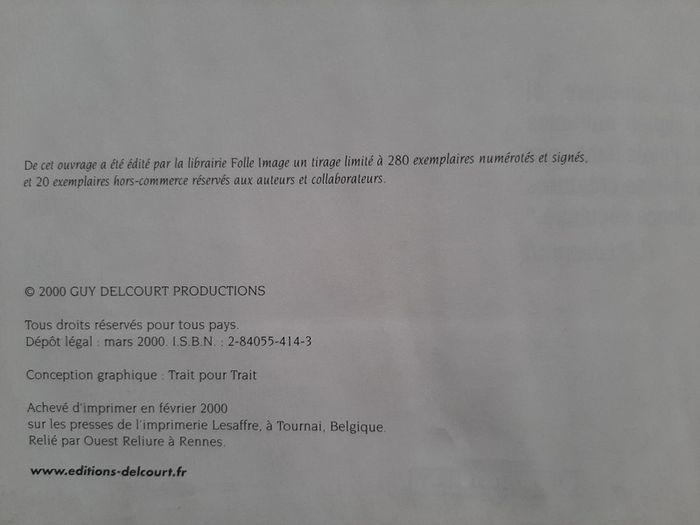 Lot de 3 tirages limités des 3 premiers albums de la série édité pour la librairie Folle Image, avec chacun un ex-libris 1. Testament (T1) * première édition de 2000 (EO) * n°80 sur 280 exemplaires, dos toilé * avec un ex-libris petit format attaché, numéroté et signé par Charlet * très bon état, un léger écartement à signaler entre 2 pages en fin d'album (voir photos) 2. Prémonition (T2) * première édition de 2000 (EO) * n°224 sur 350 exemplaires, dos toilé * album signé et numéroté par Charlet * avec ex-libris non attaché grand format numéroté et signé * très bon état (voir photos) 3. Matrice (T3) * première édition de 2002 (EO) * n°273 sur 350 exemplaires, dos toilé * album signé par Charlet * avec ex-libris non attaché moyen format numéroté et signé * contient 8 pages supplémentaires d'un carnet graphique en plus de la BD * très bon état, un coin est en partie écrasé (inférieur droit premier de couverture, voir photos) Une série BD de Éric Corbeyran (Le Chant des Stryges, Le Clan des Chimères) et Grégory Charlet, éditions Delcourt pour Folle Image (il n'existe pas de tirage de tête ou de luxe pour Le Maître du Jeu).