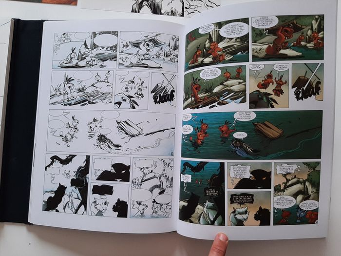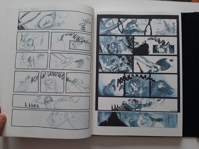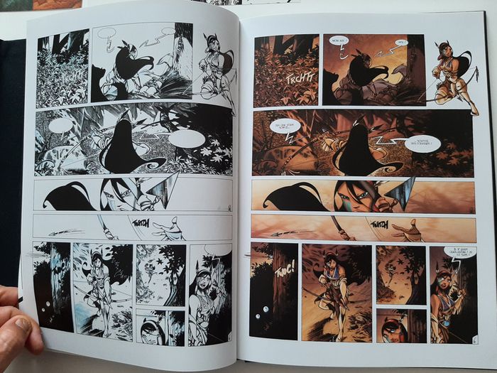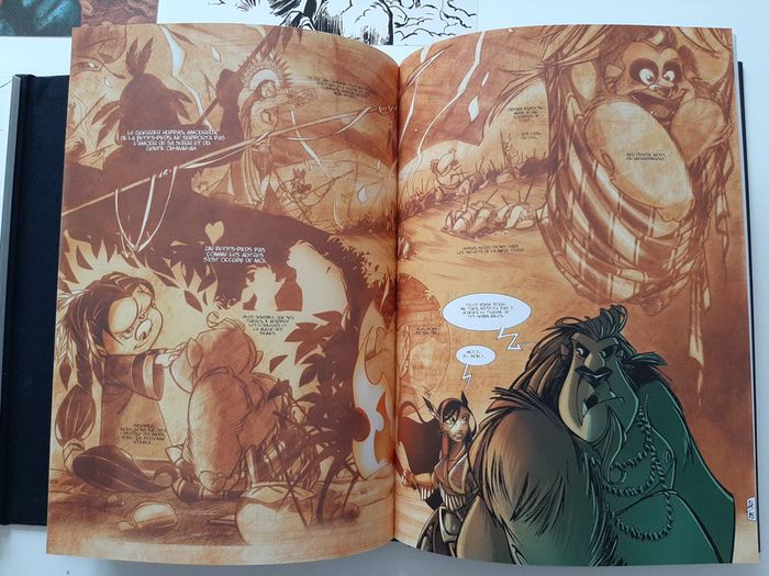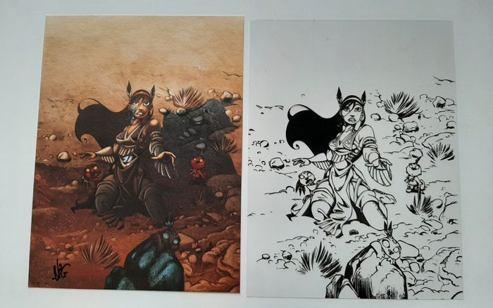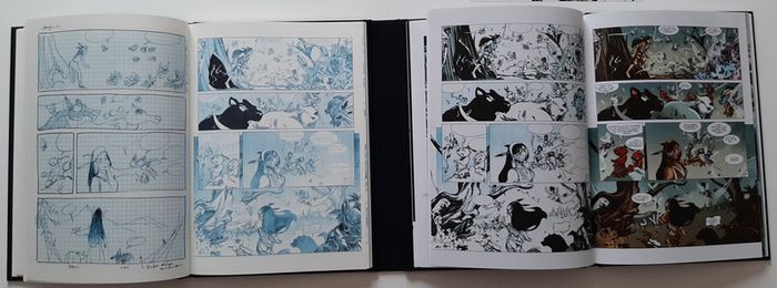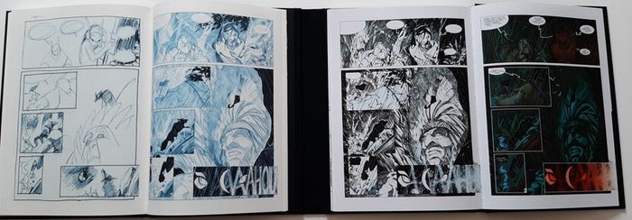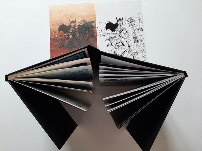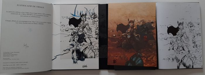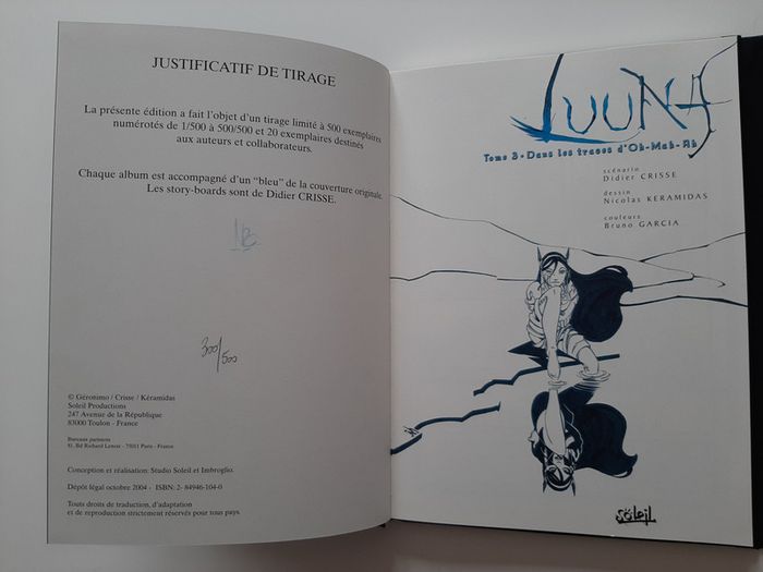 Tirage de tête (500 ex + 20 HC) exceptionnel car décliné en 4 versions du tome 3 de la série Luuna: "Dans les traces d'Oh-Mah-Ah": - coffret noir avec Drunna en lettres brillantes, double rabas, dos toilé noir - album en quadruple éditions (2 albums doubles pages intégrés cote à cote dans le coffret): * album de gauche : story board à gauche + crayonné à droite * album de droite: encrage à gauche + mise en couleur à droite (comme l'édition du commerce) - ex-libris couleur de la couverture signé par Kéramidas - calque noir et blanc de la couverture Album EO n°300/500 en très bon état (voir photos). Scénario de Didier Crisse, dessins de Nicolas Kéramidas, couleurs de Bruno Garcia 2004 Soleil Production & Imbruglio, Géronimo / Crisse / Kéramidas