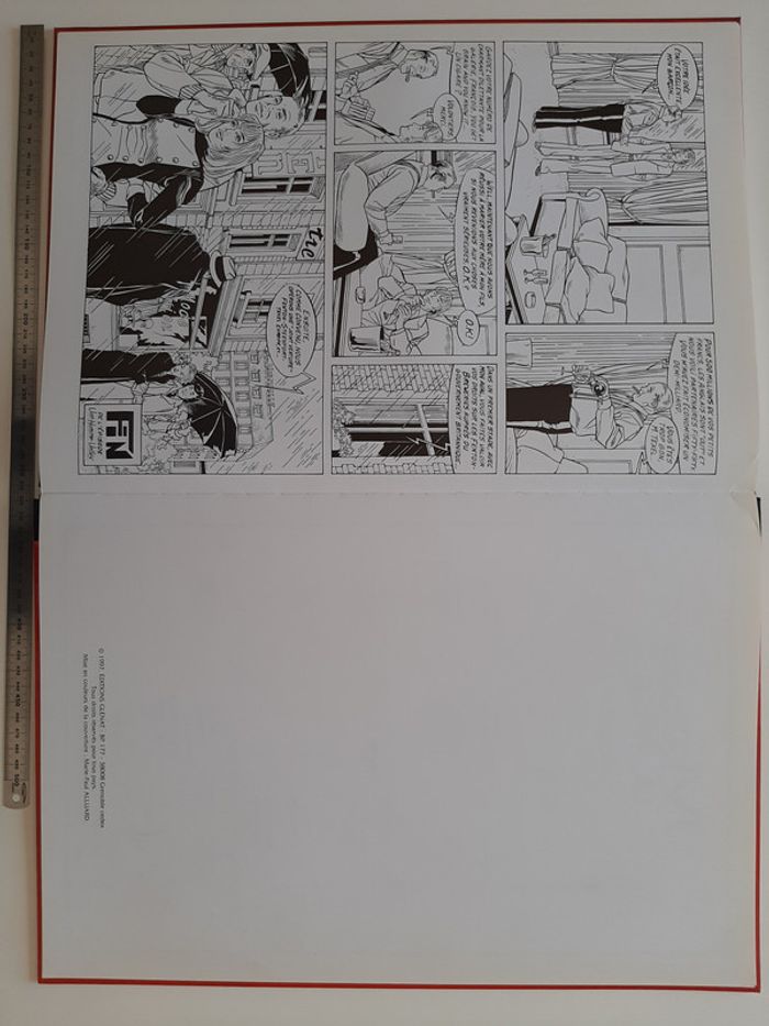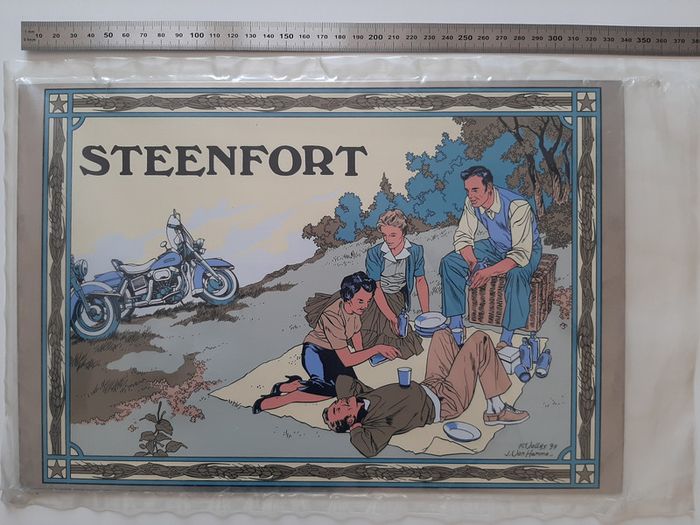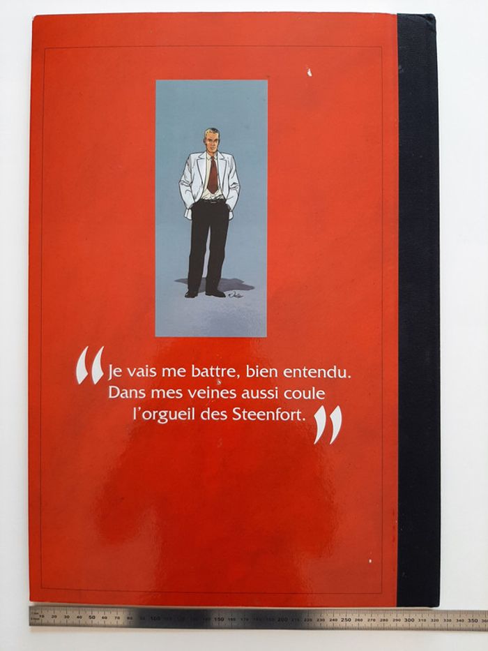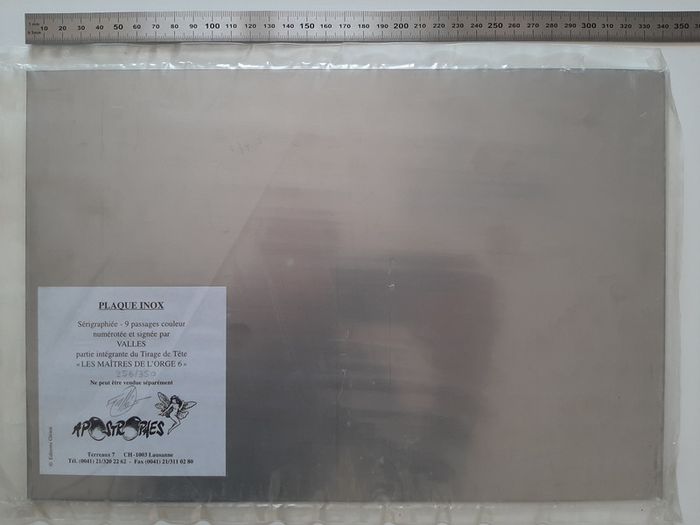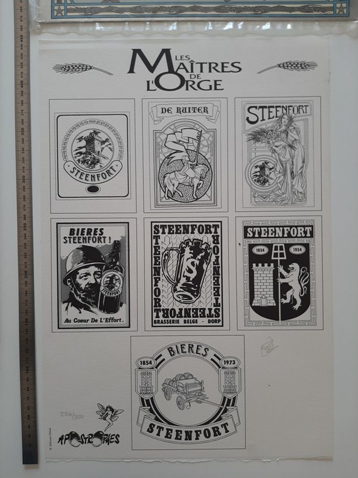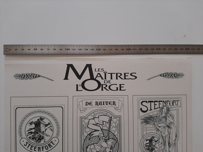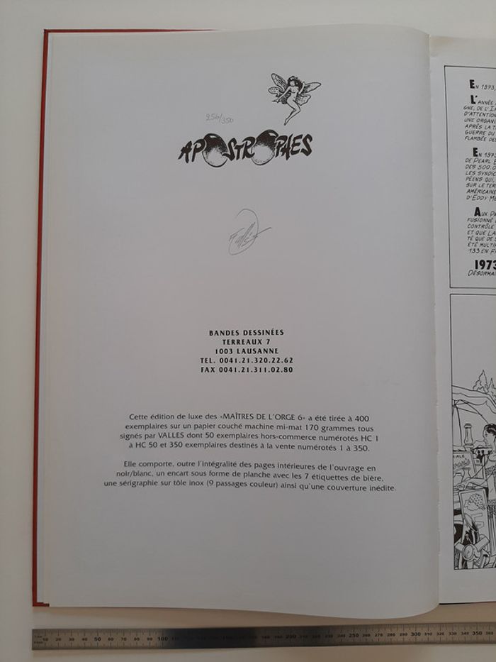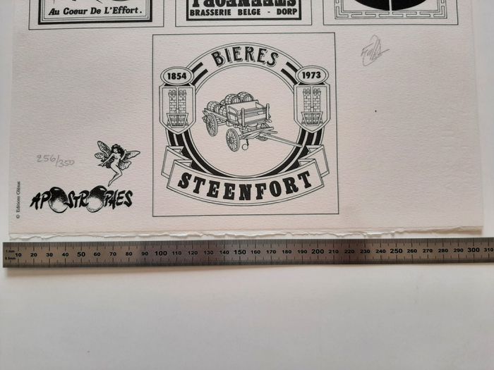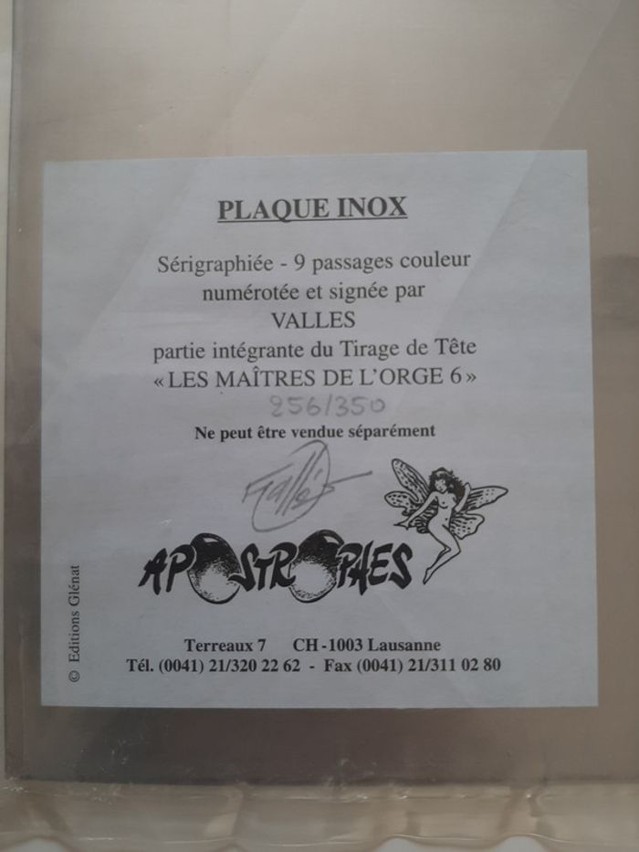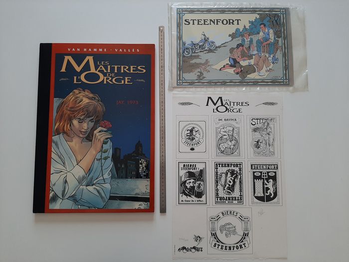 Tirage de tête complet tiré à 350 exemplaires + 50 HC, contenant: - l'album Les Maitres de l'Orge "Jay, 1973" (tome 6) de Jean Van Hamme et Francis Vallès * très grand format cartonné (31 X 47 cm) * impression noir et blanc (N&B) * numéroté et signé par Francis Vallès * dos toilé noir - 1 planche de 7 étiquettes de bière "Steenfort" en noir et blanc: * ex-libris numéroté et signé par Francis Vallès * logo Apostrophes * 30.5 X 45 cm - une plaque sérigraphiée "Steenfort" en inox : * sérigraphie 9 passages couleur sur plaque de métal * X 34 cm * numéroté et signé au dos par Francis Vallès * protégé sous film plastifié Album en très bon état excepté 3 petits impacts sur le 4eme plat et un coin abimé (voir photos) Il s'agit du n°256/350. Editions Glénat - Apostrophes (Lausanne) - 1997