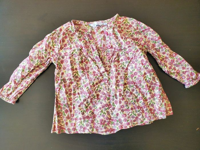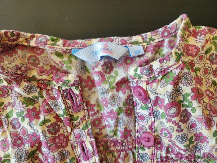 Chemisier à fleurs rose et vertes et fond blanc et jaune. Coton Taille 12mois Bon état