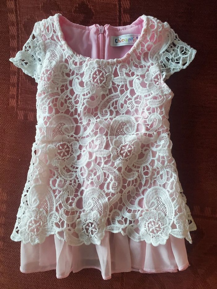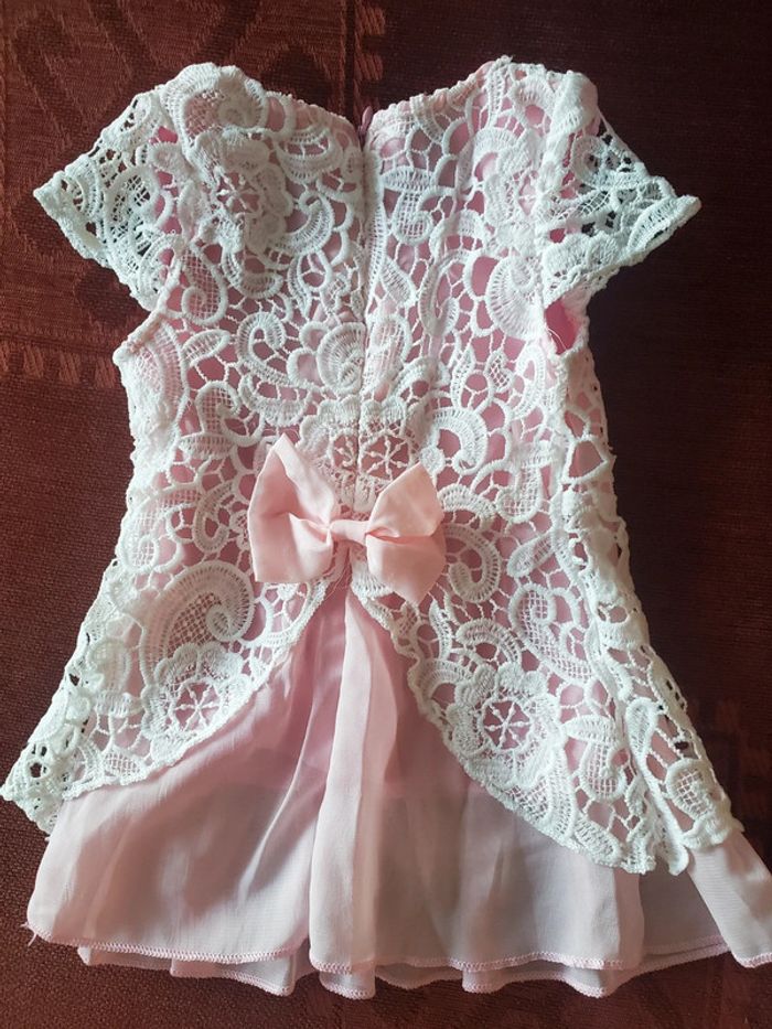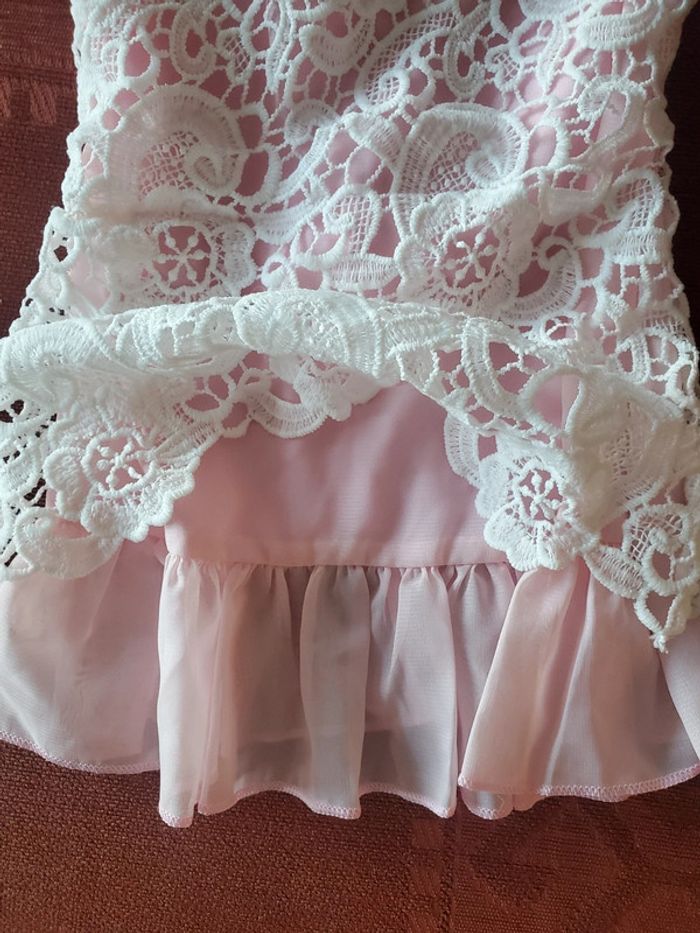 Jolie dentelle blanche et voile rose poudré + doublure (soit 3 couches légères) pour cérémonie. zip invisible dans le dos. Taille 12M Très bon état