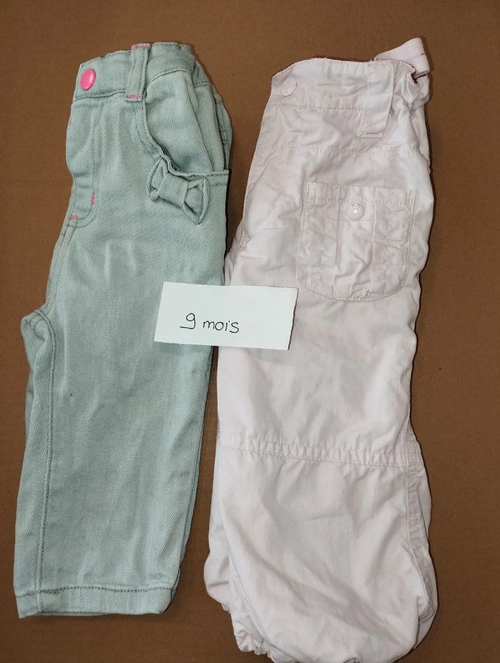 Lot de 2 pantalons taille 9 mois. L'un effet jean et l'autre doublé et rembourré. Très bon état
