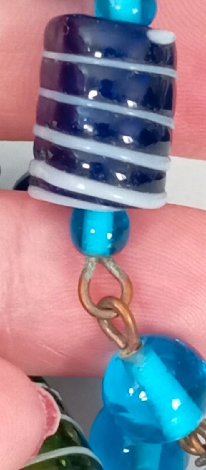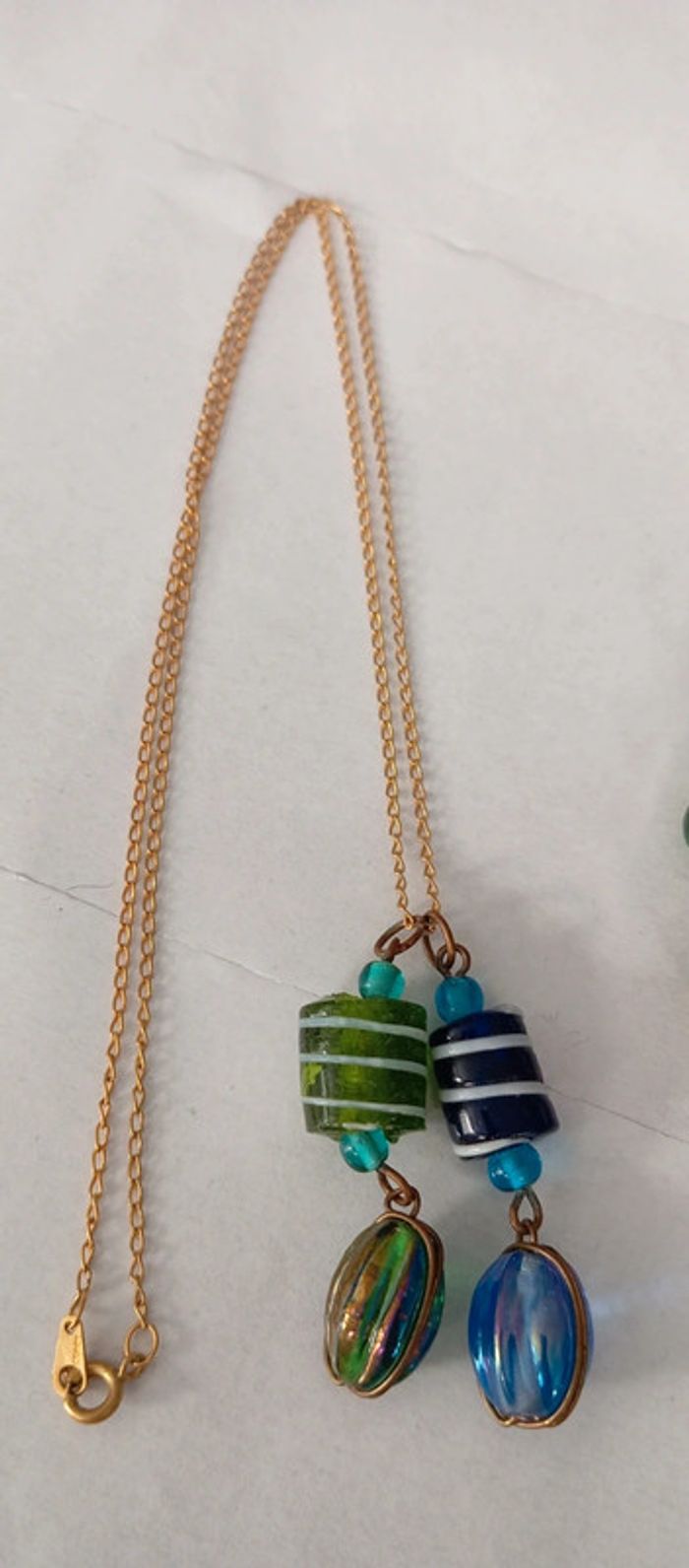En bon état général il y a un bracelet dans les tons bleus, un bracelet dans les tons verts et deux pendentifs sur chaîne bleu et vert. les bracelets sont légèrement oxydées articles vintage Pensez aux lots ! #baronneparure
