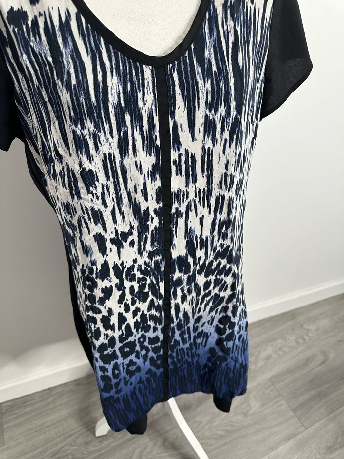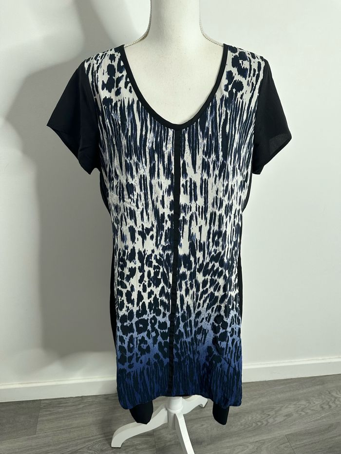 Robe - Excellent état - Taille 42 équivalent XL - Bleue, blanche et noire - Miss Captain Trend - Imprimés léopard effet tie and dye - Manches courtes - Viscose et polyester Dimensions: - 52cm niveau aisselles - 92cm de long