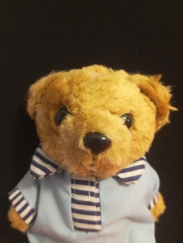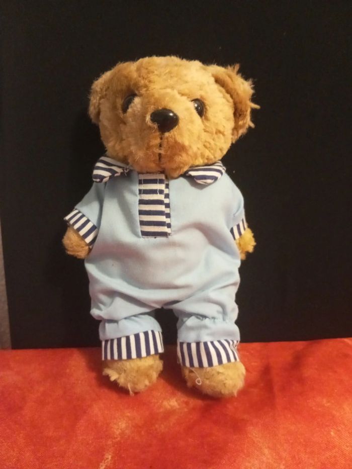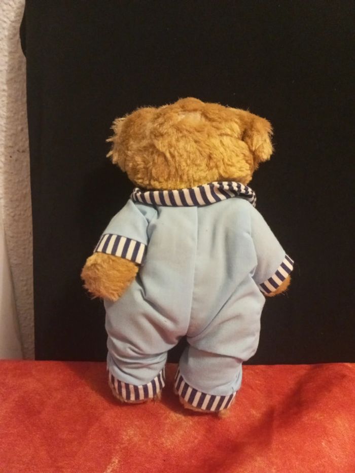 Ours ourson en pyjama bleu et blanc, yeux et nez noires, je ne connais pas la marque. Très bon état, il devait y avoir un bonnet car il y a des scratchs sur le haut de la tête voir la dernière photo. Dans mon dressing, il y a d'autres peluches, des Petshop, des Lego Duplo, des Playmobil, des Barbie et beaucoup de jeux et jouets Vintage