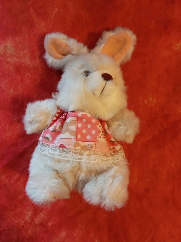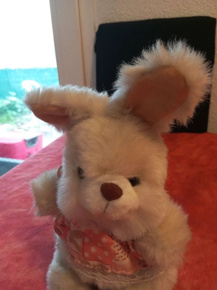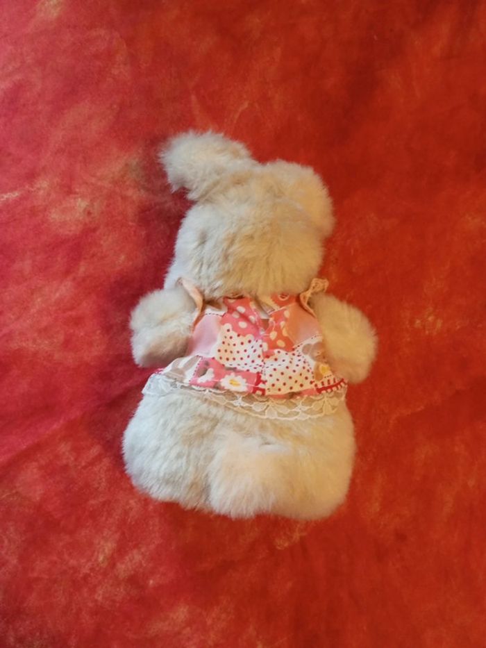 Dame lapin lapine avec robe rose imprimé et dentelle. je ne connais pas la marque. Très bon état, vendu comme sur les photos Dans mon dressing, il y a d'autres peluches, des Petshop, des Lego Duplo, des Playmobil, des Barbie et beaucoup de jeux et jouets Vintage