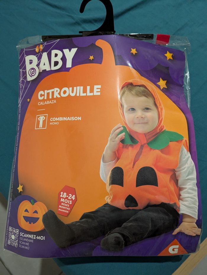 Déguisement Halloween citrouille taille sur l'emballage 18-24 mois Perso je l'ai pris pour mon fils de 7 mois et c'était parfait.