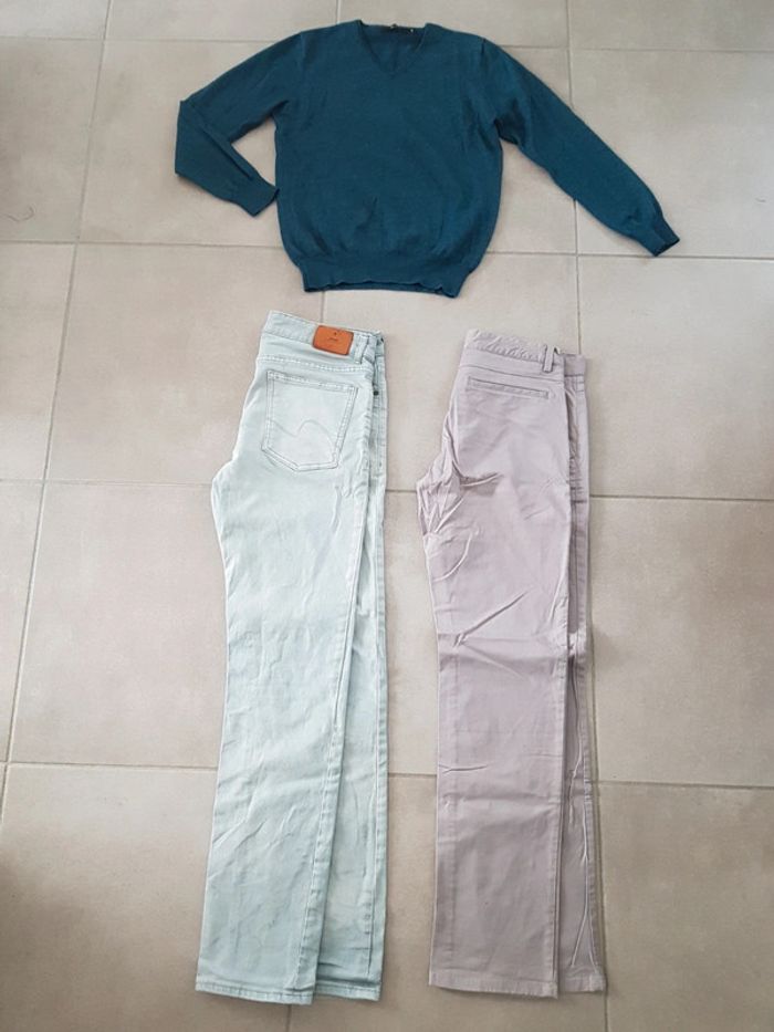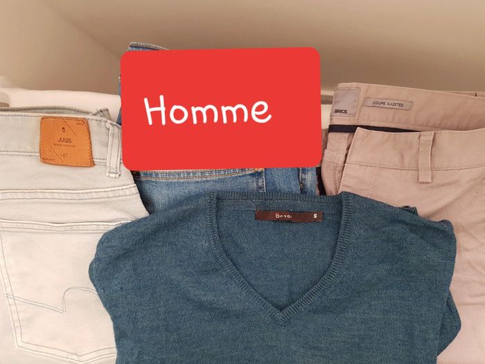 Lot Homme 38-40 Jules Brice,pantalon,jean, Pull chaud 50%laine En lot ou séparé faire demande Pantalon Brice coupe ajustée T40 10e acheté 50e Jean gris bleu clair Jules T 38 10e acheté 50e Pull col V vert bleu canard taille S 50% laine 15e acheté 40e