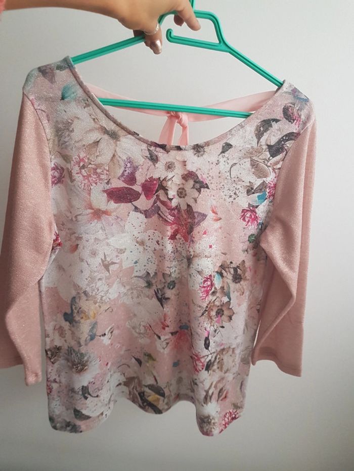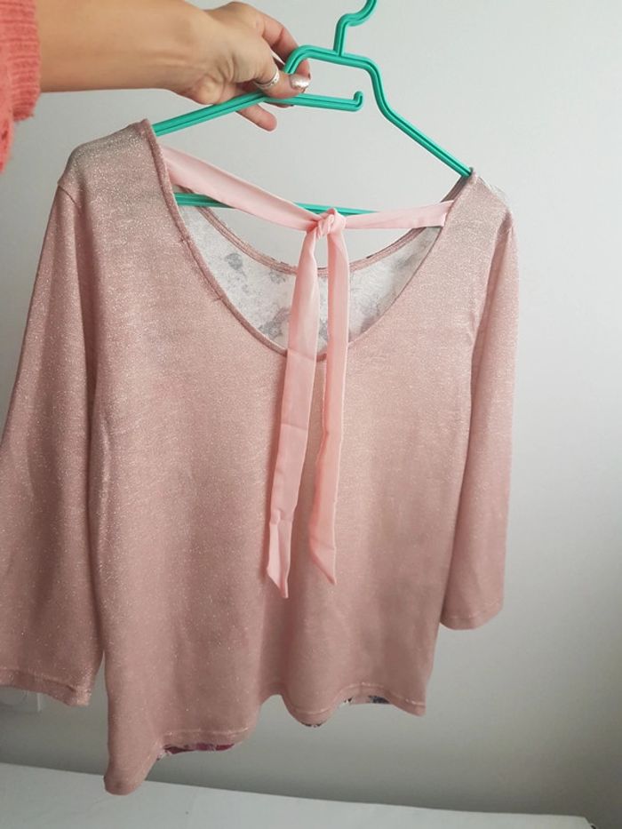Magnifique pull fin haut fleuri Rosé irisé dos ruban cou à nouer T 42 44 T42 44 Largeur aisselle à aisselle = 54cm Tissu rosé poudré légèrement pailleté