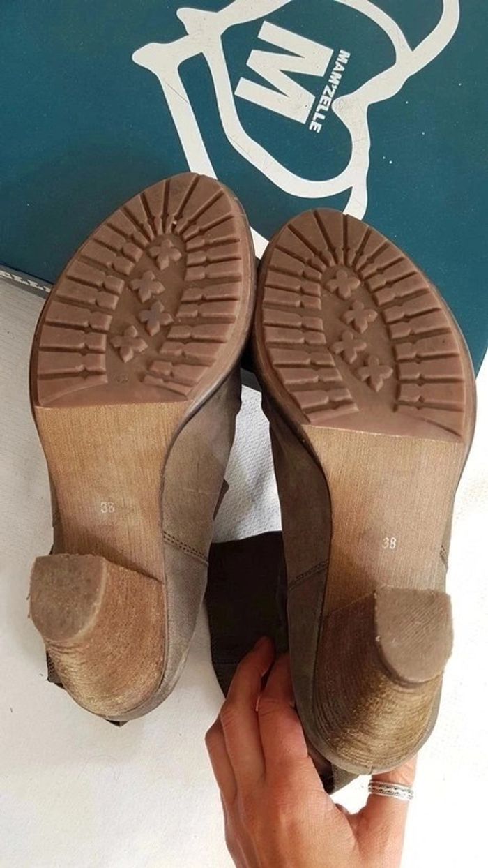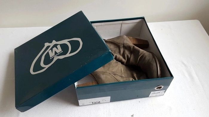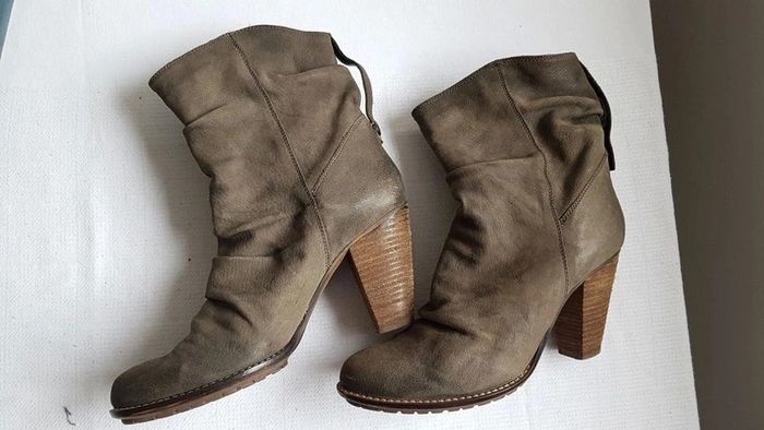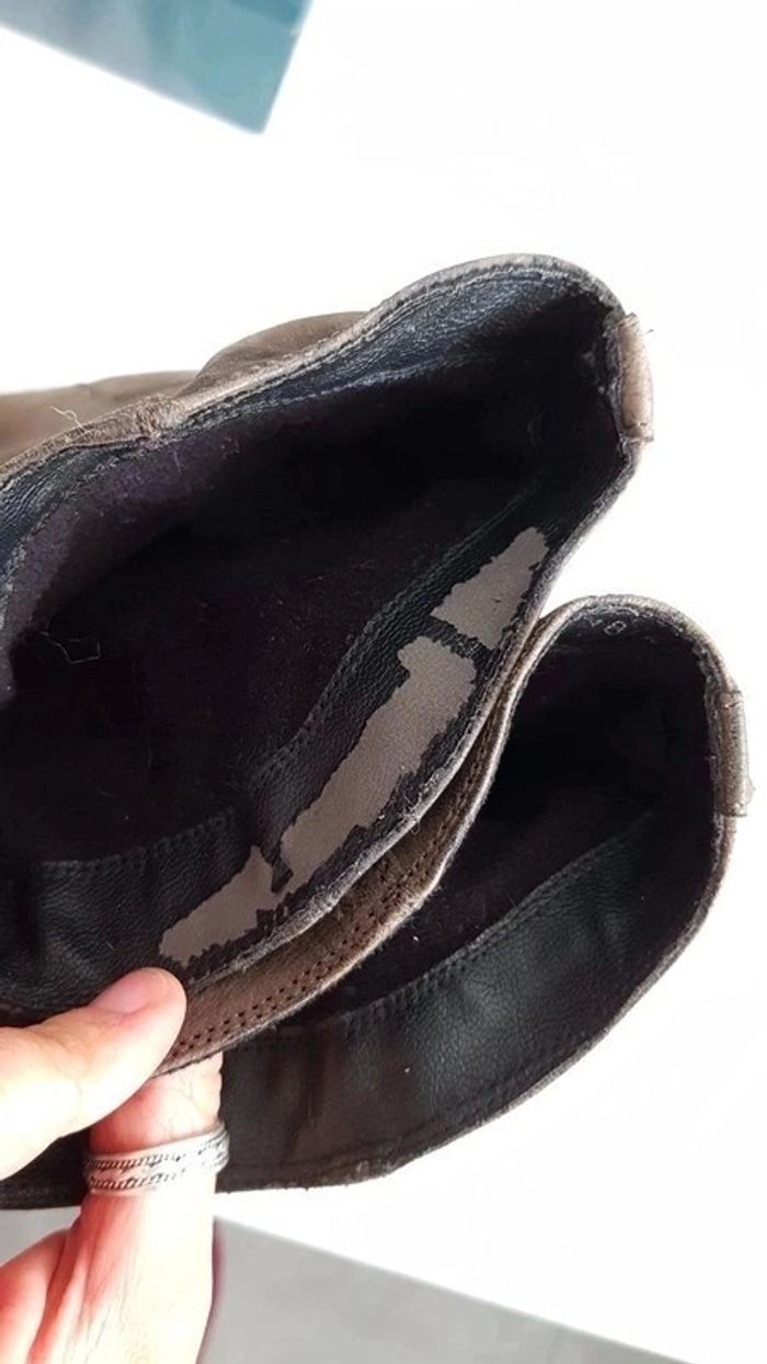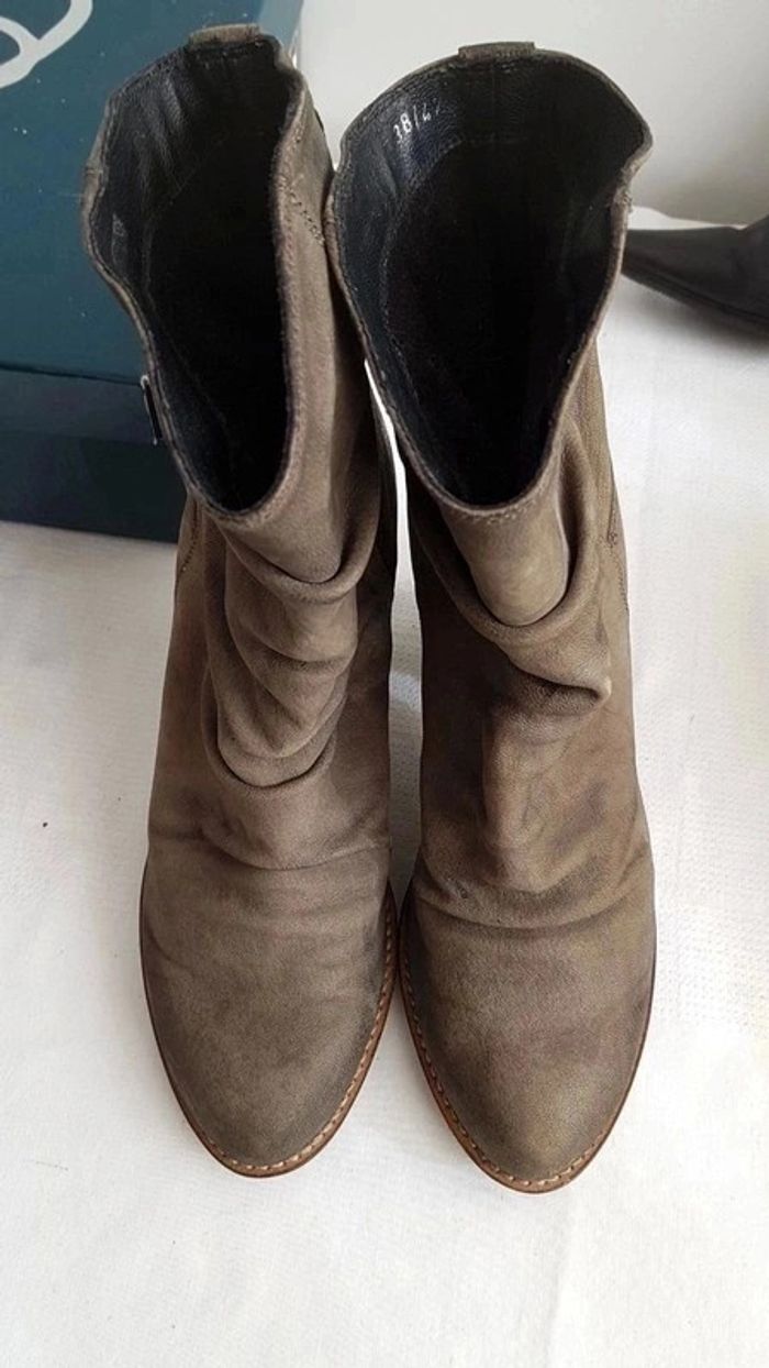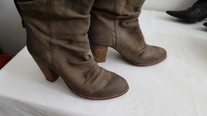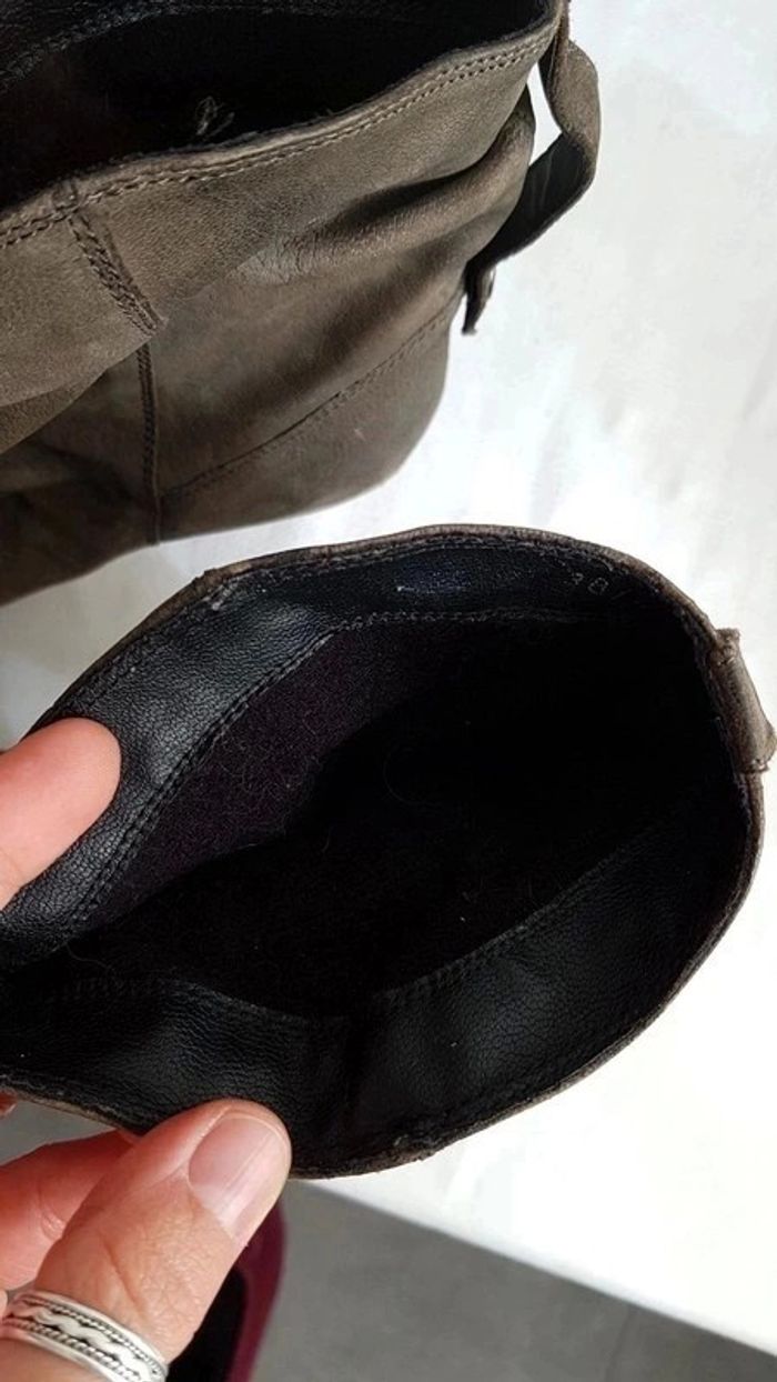 Super sympa Couleur entre le gris et le kaki.... Avec robe jupe pantalon robe longue Porté 2 fois voir etat semelles exterieure Interieur extérieur impeccable Interieur chaud Petit défaut voir derniere photo...e retirant l etiquette le collant à dechiré 1 partie .non visible portées