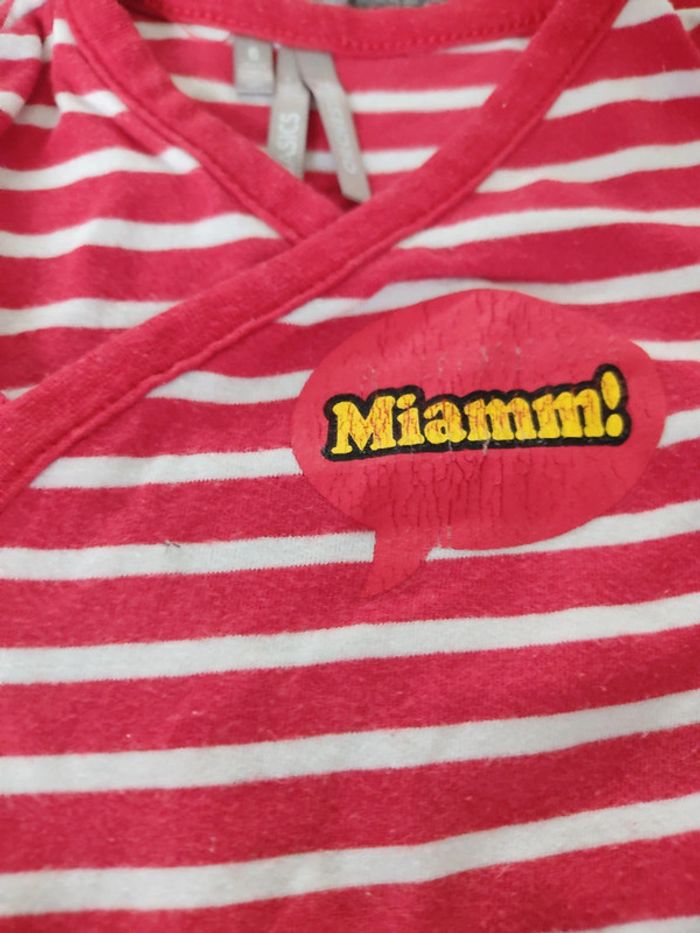 Lot de 3 bodies taille 6 mois. Ont été portés mais restent en bon état. Le tissu peluche un peu et le dessin du Miam est craquelé. #sabine69780garcon6mois
