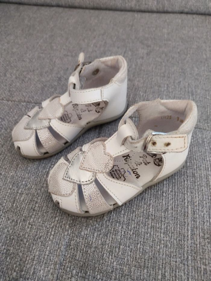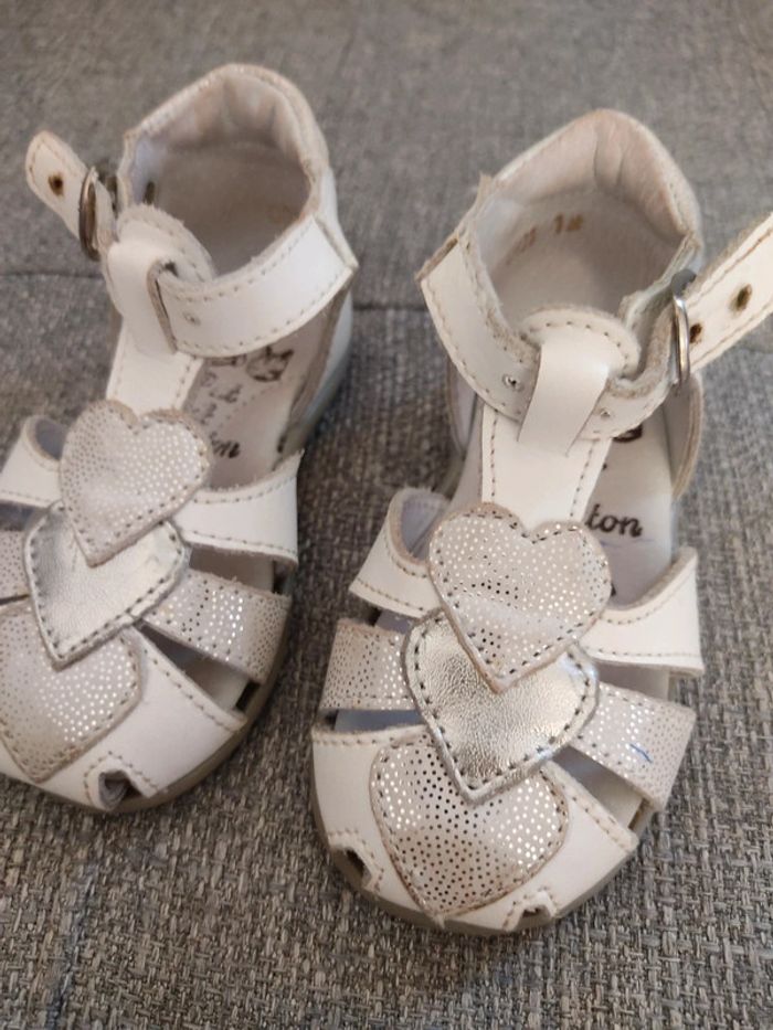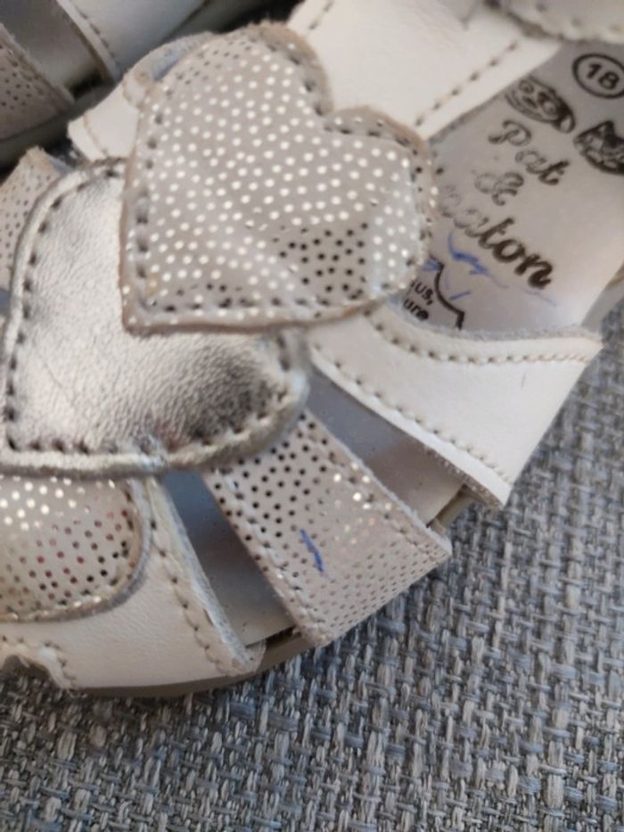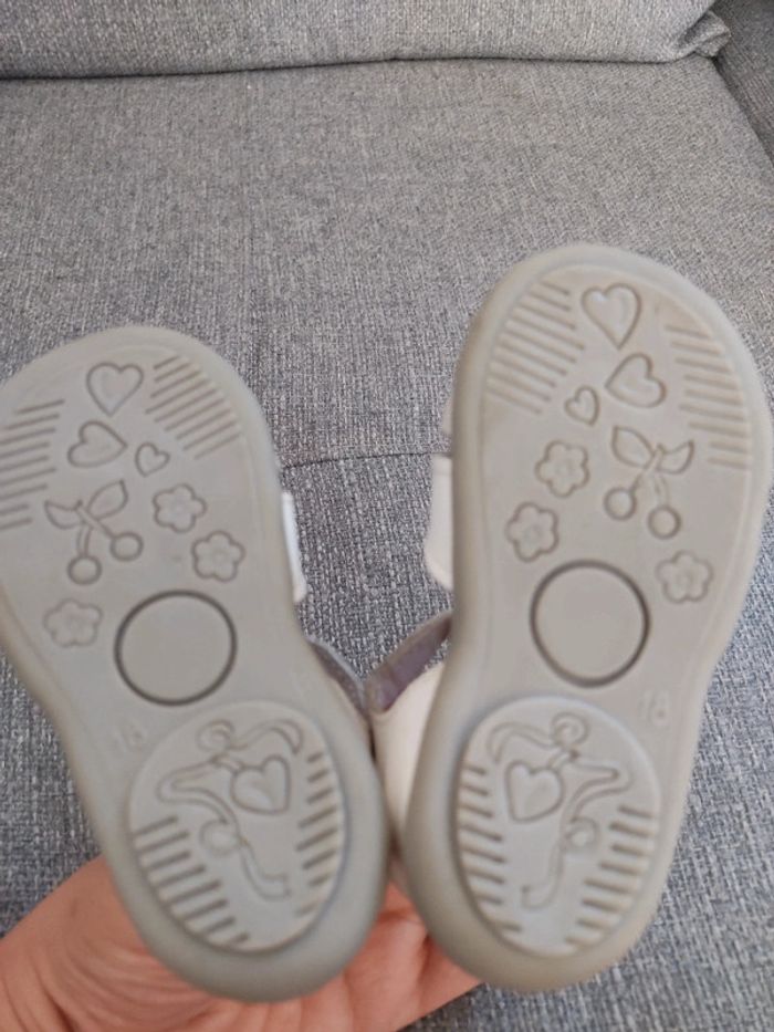 Chaussures pointure 18 en très bon état. Ma fille ne marchait pas lorsqu'elle les a porté. A noter: un trait de stylo est présent, je n'ai pas voulu frotter pour ne pas risquer d'abîmer les paillettes. Je n'ai plus la boîte d'origine. #sabine69780chaussuresbebe