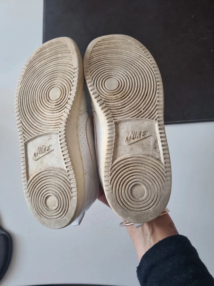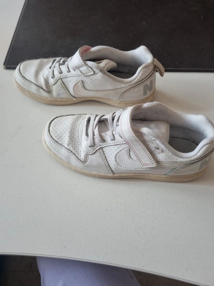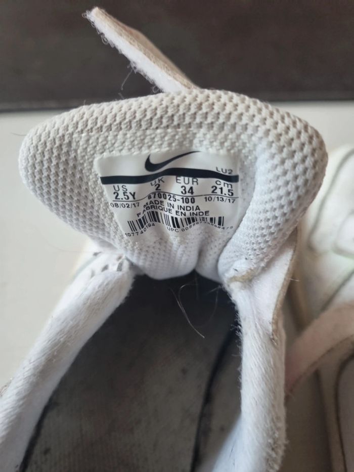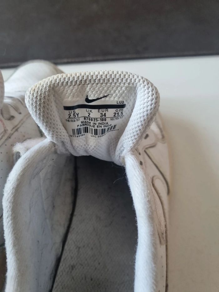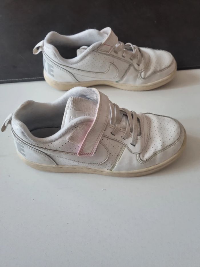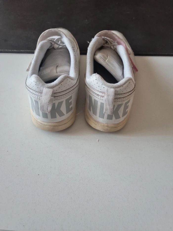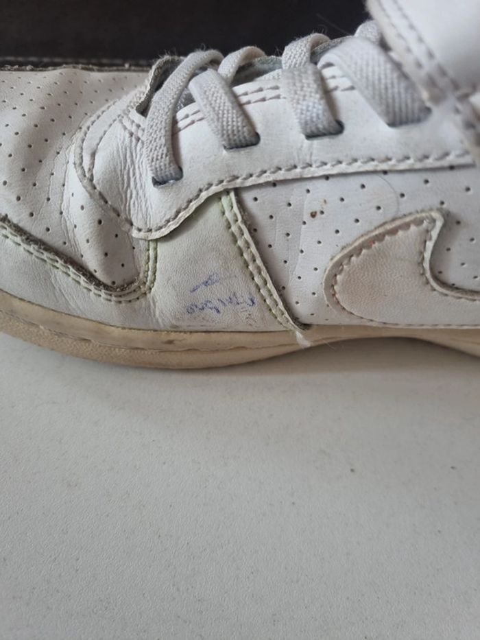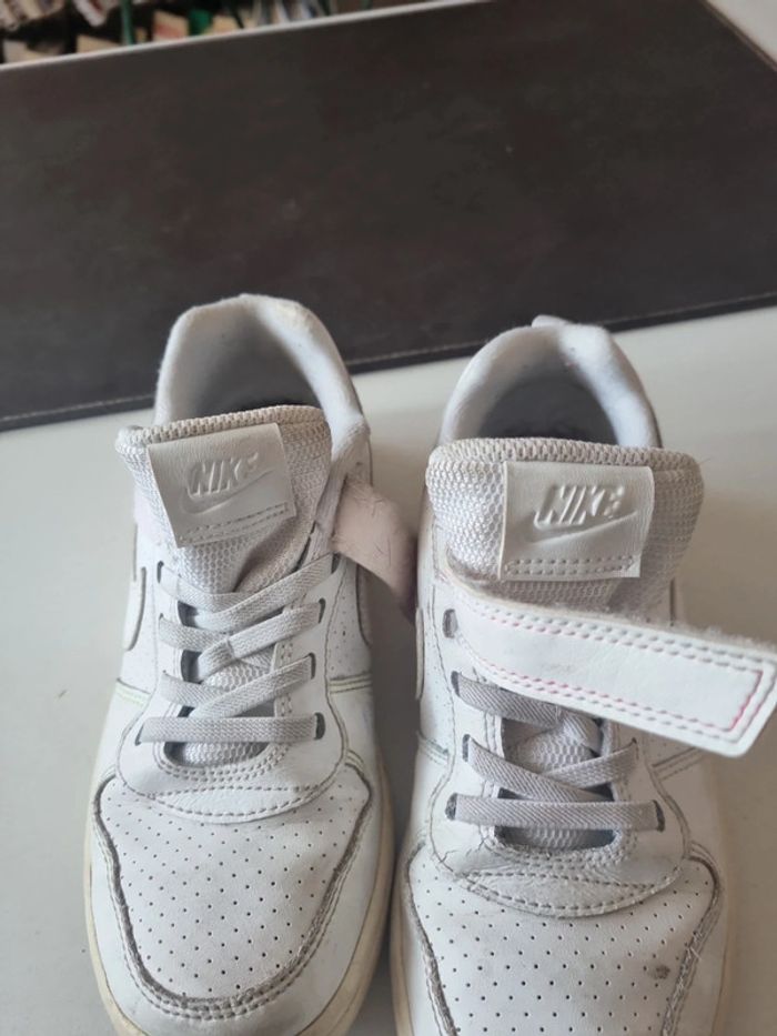 Baskets nike 34 blanches à scratch, une marque de stylo sur le côté et colorées au niveau des coutures #somara66chaussures