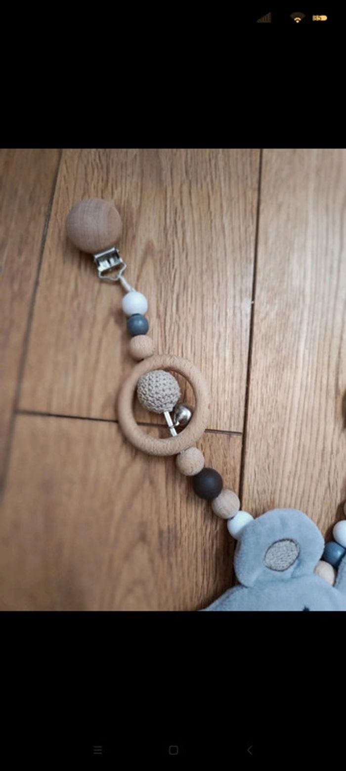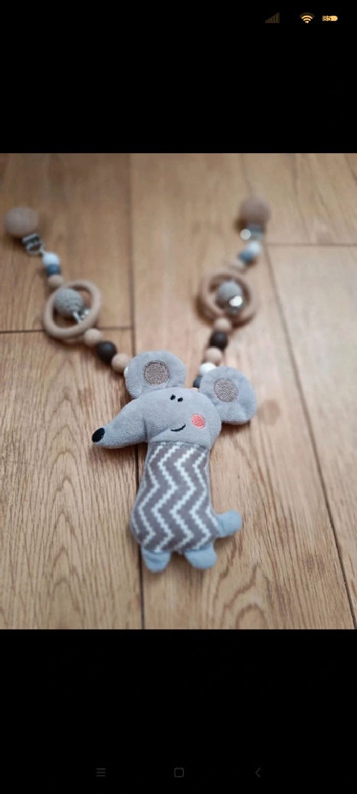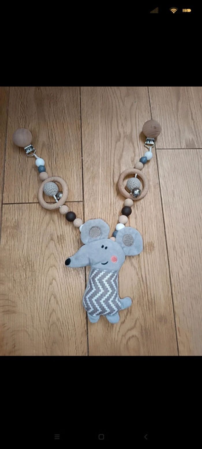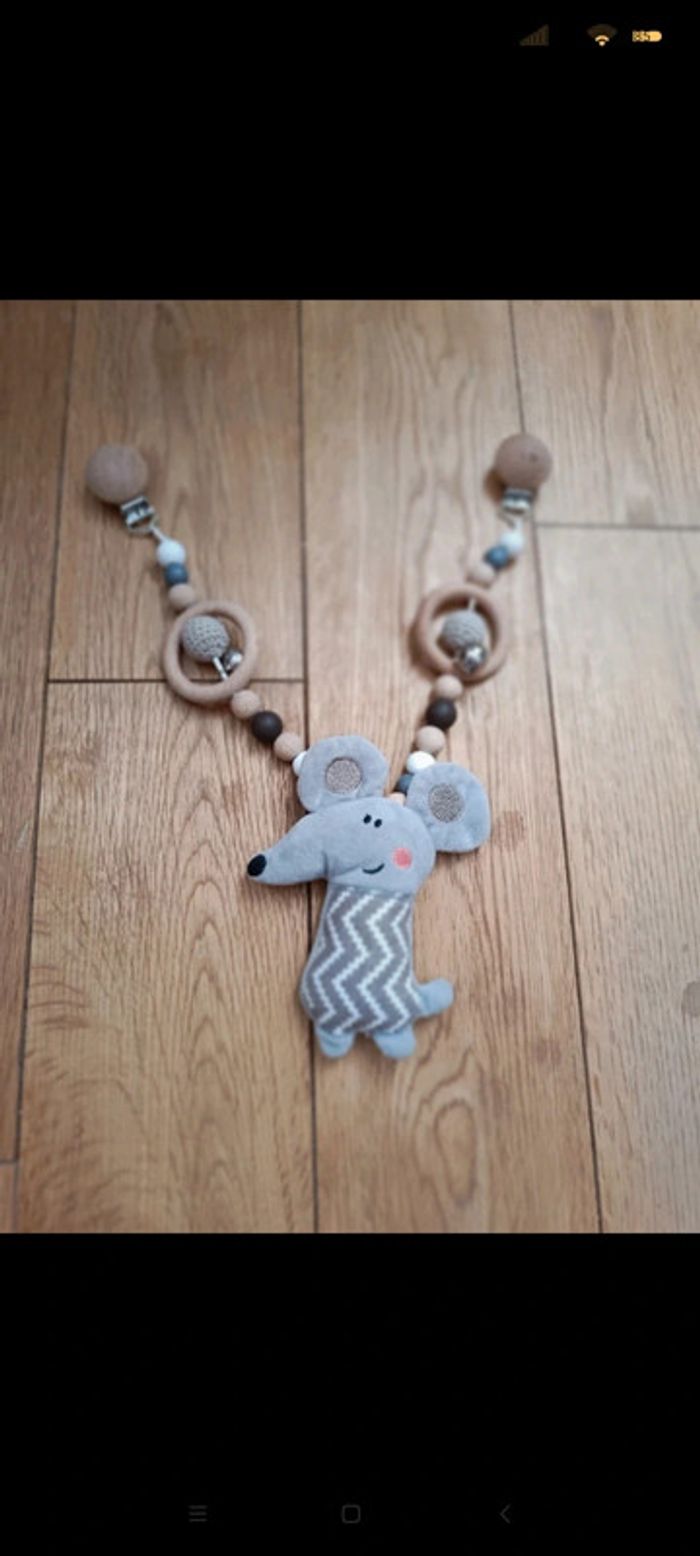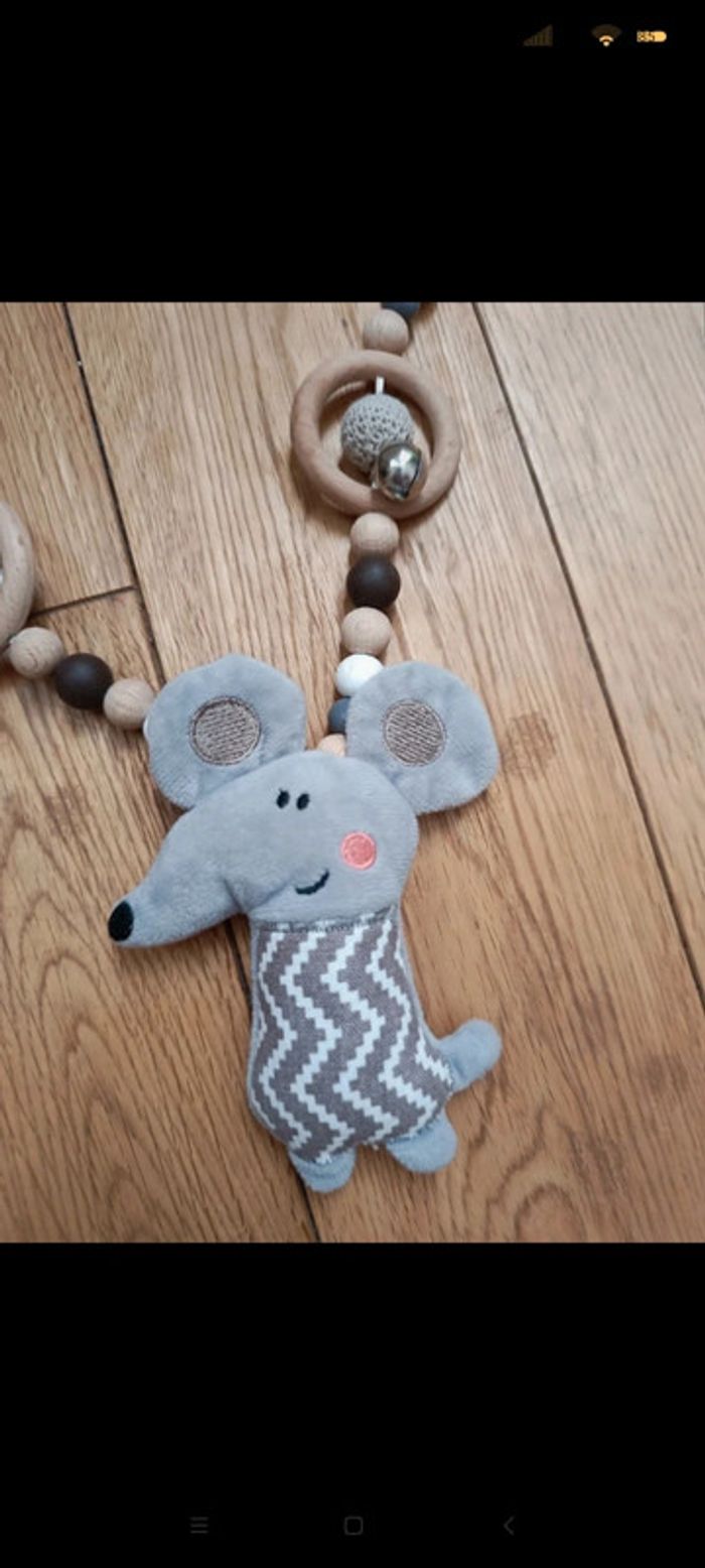 Chaîne de poussette en très bon état en bois avec grelot et peluche petite souris. N hésitez pas à faire un lot pour bénéficier de réductions.