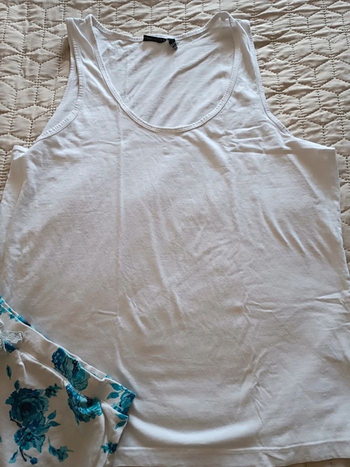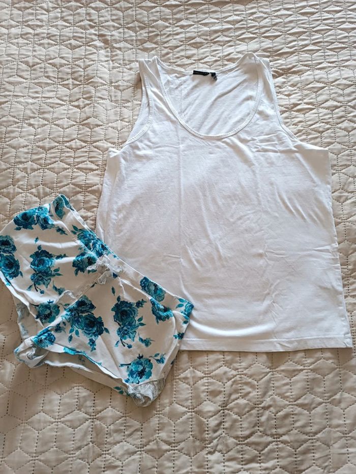Pyjama été femme avec débardeur et short blanc et bleue avec des roses . Le short est noté L mais taille petit donc plutôt un M. N hésitez pas à faire un lot pour bénéficier de réductions.