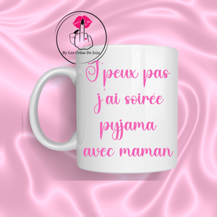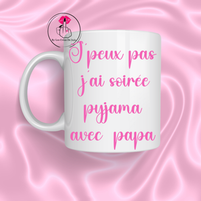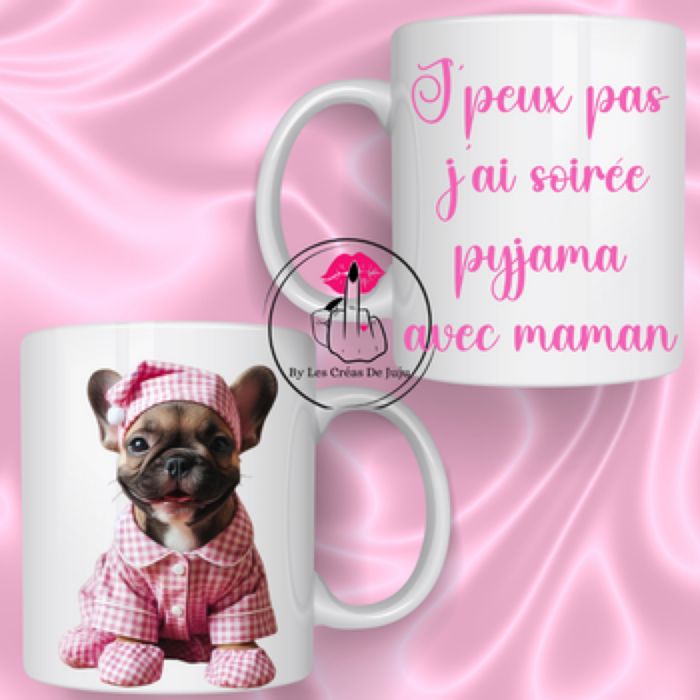 Mug tasse humoristique bouledogue Français femelle personnalisable. J'peux pas j'ai soirée pyjama avec maman ou papa Version femelle et autres races disponibles En céramique contenance 340 ml